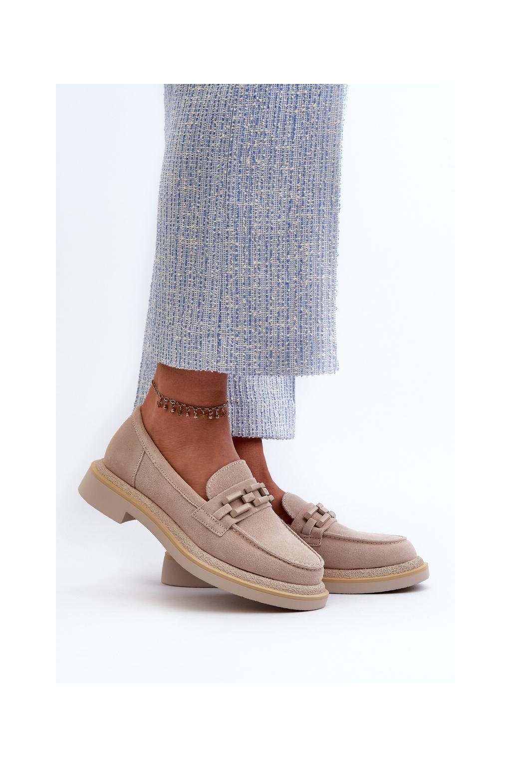 Dámské mokasíny vyrobené z přírodní semiše. Plochý podpatek zaručuje stabilitu a pohodlí při chůzi. Dodatečný ozdobný prvek vpředu jim dodává originalitu, což je činí nejen praktickými, ale také módními. Tyto mokasíny budou ideálním doplňkem mnoha různých stylů, jak ležérních, tak formálnějších.