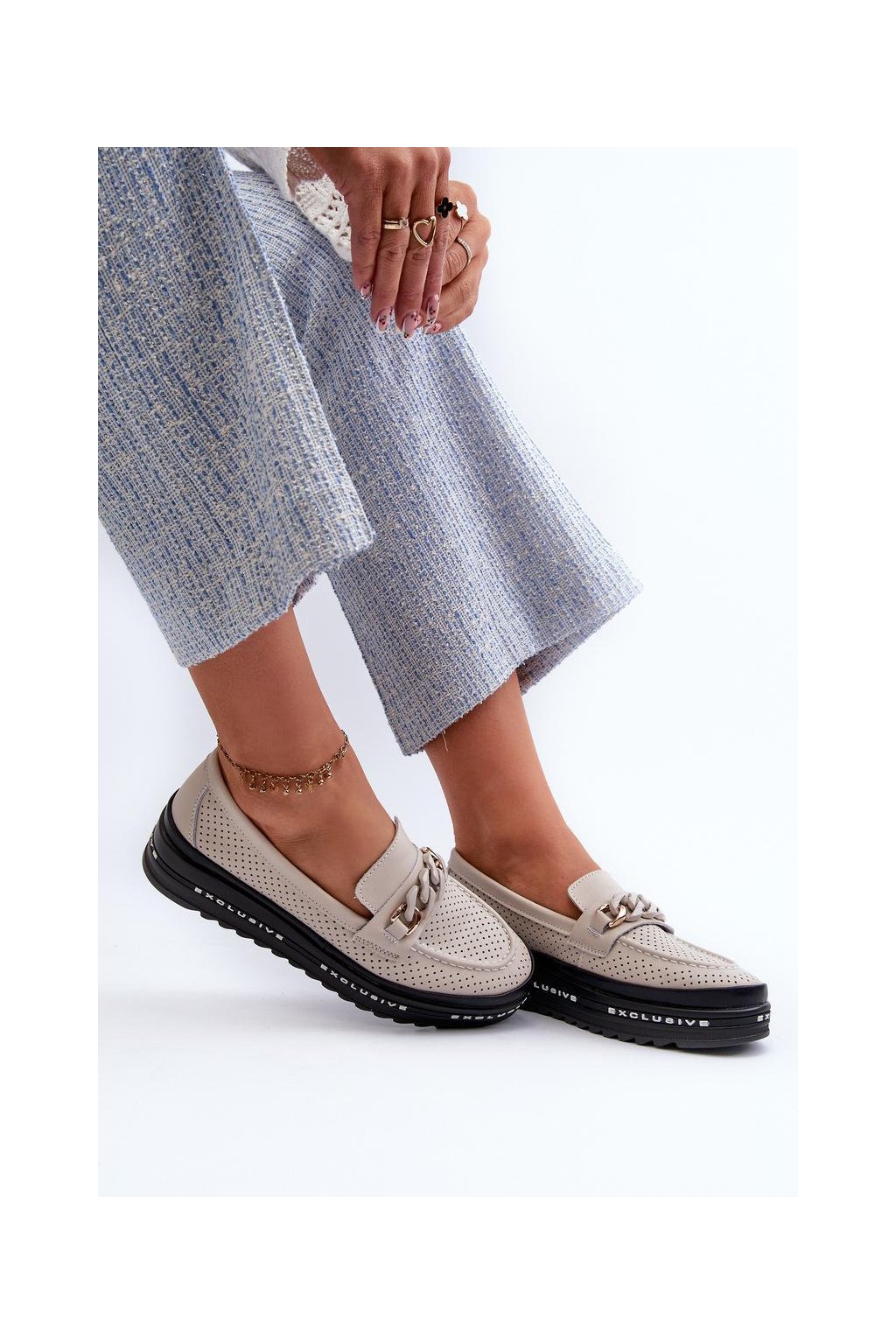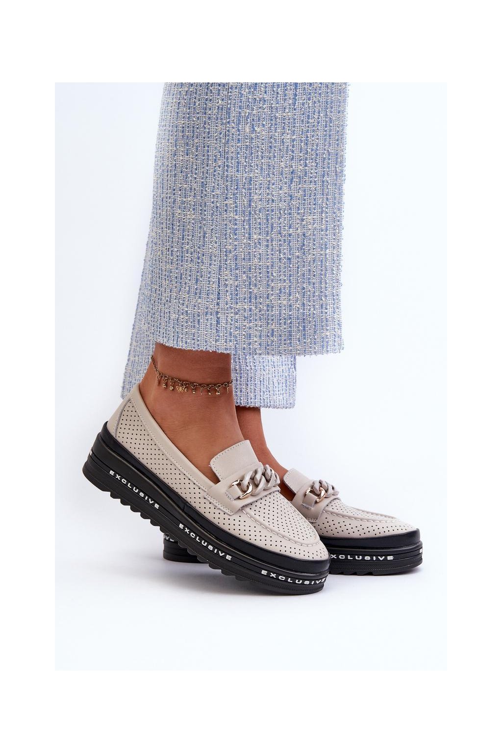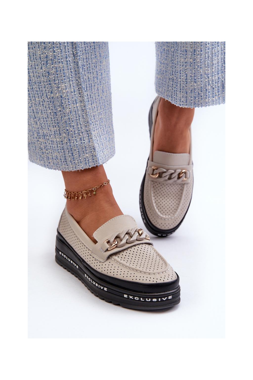 Dámské mokasíny vyrobené z přírodní kůže. Vpředu je pásek s řetízkem. Jsou umístěny na platformě, která zajišťuje dodatečné odpružení a stabilitu při chůzi. Kožená vložka comfort. Tyto módní mokasíny skvěle doplní různé stylizace!