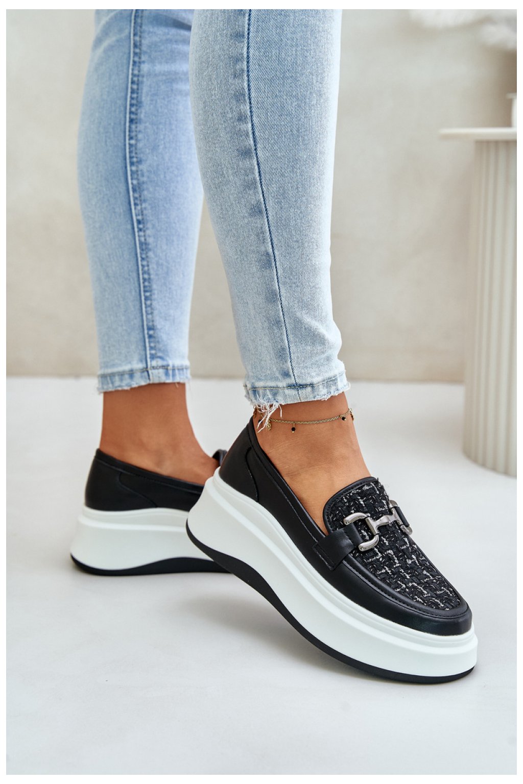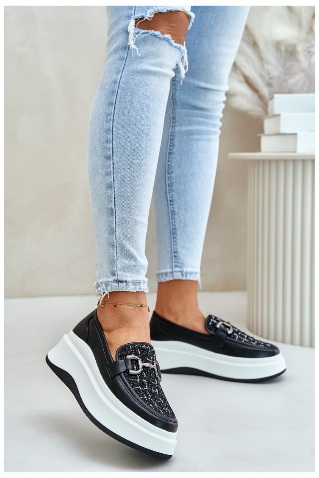 Elegantní dámské mokasíny z přírodní kůže jsou ideální volbou pro ženy, které ocení klasický styl s moderním nádechem. Stojí na platformě. Na přední straně boty je ozdoba, která dodává jedinečný charakter. Zaoblená špička. Ideální pro každodenní i formálnější outfity.