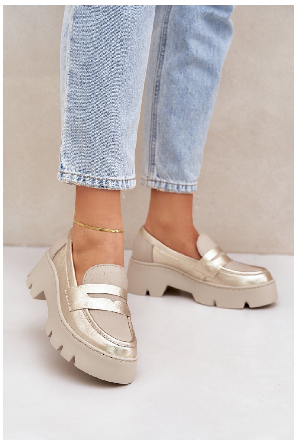 Mokasíny dámské z přírodní kůže jsou elegantní a stylovou volbou na každou příležitost. Umístěné na platformě a masivním, plochém podpatku poskytují pohodlí a stabilitu po celý den. Zaoblené špičky jim dodávají jemný charakter a ozdobný pásek s výřezem vpředu dodává moderní akcent. Tyto mokasíny spojují eleganci s pohodlím a jsou skvělou volbou pro různé styly.
