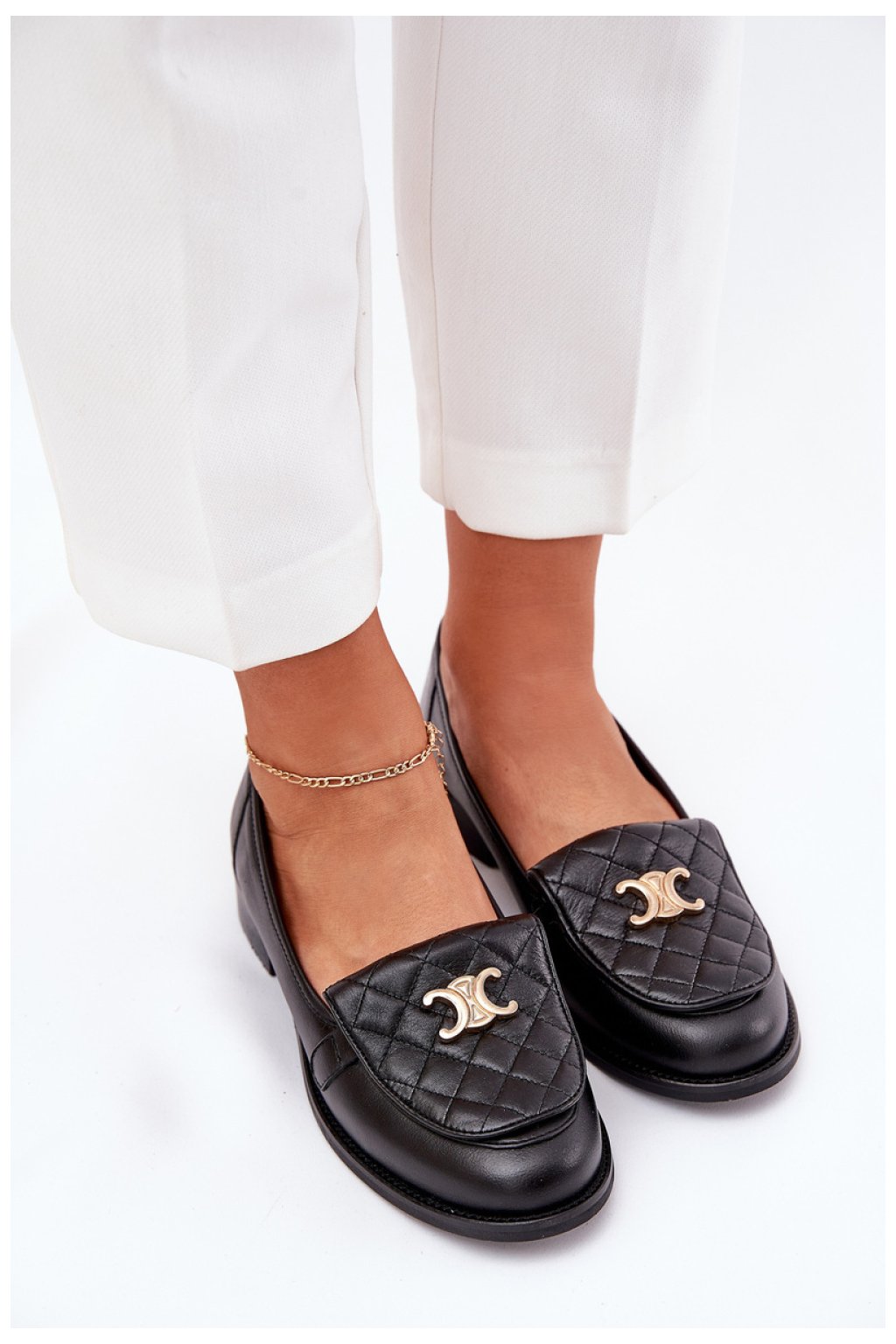 Elegantní dámské mokasíny vyrobené z vysoce kvalitní přírodní kůže. Přední část bot zdobí jemné prošívání a zlatý prvek, který jim dodává eleganci a jedinečný charakter. Zaoblené špičky dodávají modelu klasický vzhled a kožená stélka zajistí pohodlí po celý den. Ideální jak pro každodenní, tak i formální stylizace, must-have v každé ženské šatníku!
