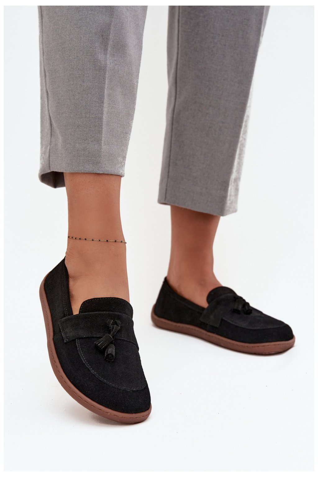 Mokasíny typu barefoot pro ženy jsou nabídkou pro ty, kteří ocení přirozený komfort a volnost pohybu. Vyrobena z měkké přírodní semiše, skvěle se přizpůsobuje tvaru nohy, poskytujíc příjemný pocit lehkosti a pohodlí při nošení. Na přední části nártu je ozdoben pásek s dvěma střapci, které celku dodávají jemný šarm a stylový charakter. Jsou to ideální boty na každý den, hodí se jak do volných, každodenních stylizací, tak i do elegantnějších outfitů.
