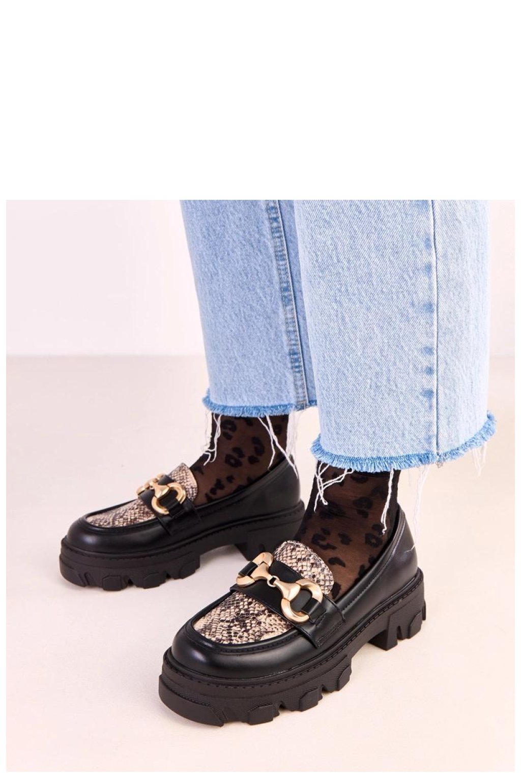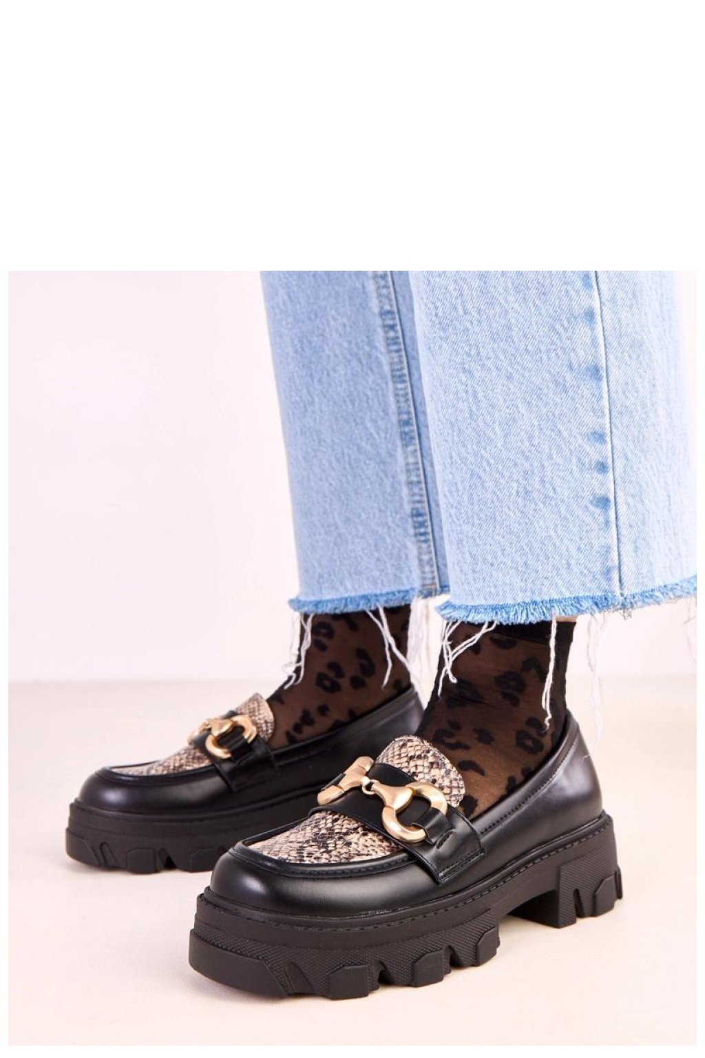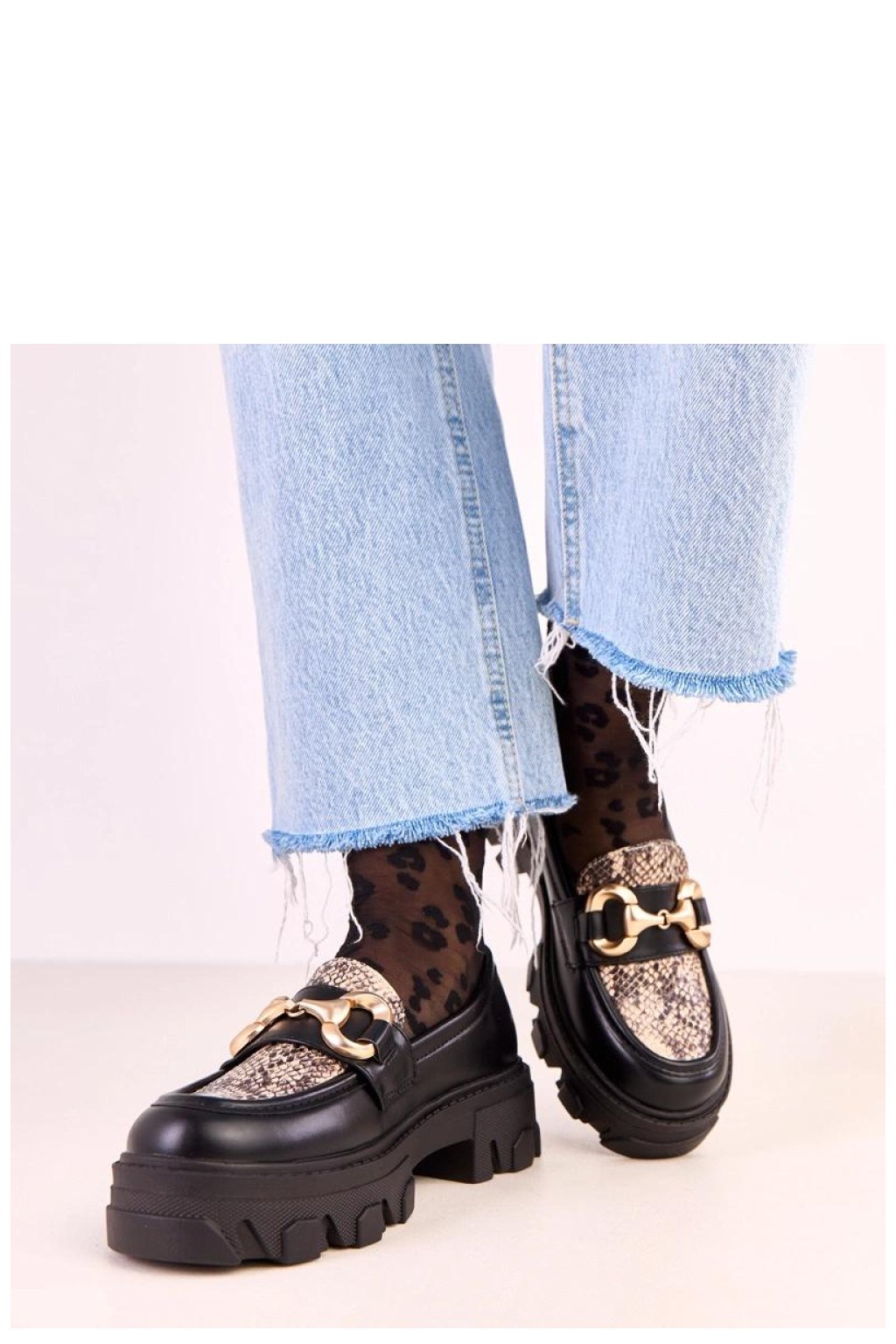 Elegantní a originální slip-on mokasíny vyrobené z vysoce kvalitní ekologické kůže, kombinující klasiku s módním, moderním akcentem. Na přední části jsou zdobeny stylovým výstřihem s motivem zvířete a zlatým doplňkem, který botám dodává výjimečný charakter. Model má kulatou špičku a stabilní podpatek o výšce 4,5 cm, který zajišťuje pohodlí při nošení. Vnější obložení zaručuje pohodlí v chladnějších dnech a vložka z ekokůže zvyšuje odolnost a potěšení z používání. Toto je nabídka pro ženy, které oceňují eleganci, pohodlí a decentní módní detaily ideální jak pro každodenní, tak i pro více stylové outfity.