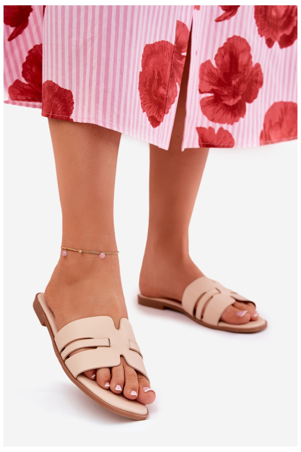Klasické dámské sandály vyrobené z ekokože, umístěné na plochém podpatku, které spojují eleganci s pohodlím. Výřezy a decentní pásek jim dodávají lehkost a moderní charakter. Ideální na každý den, tyto sandály budou skvělou volbou na teplé dny, skvěle ladící s šaty, sukněmi nebo kalhotami, kombinující jednoduchost s funkčností.