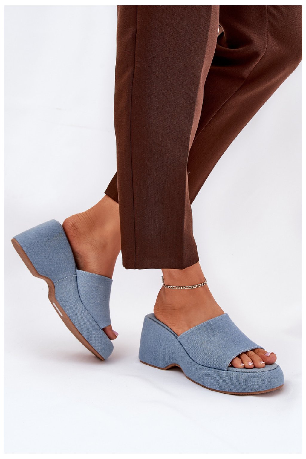 Dámské pantofle vyrobené z textilního materiálu, usazené na platformě a klínu, které spojují styl s pohodlím. Měkká stélka zajišťuje pohodlí po celý den. Ideální k lehkým šatům, látkovým kalhotám a na různá vyžití, tyto pantofle představují dokonalý doplněk mnoha letních stylizací, přidávající lehkost a eleganci.