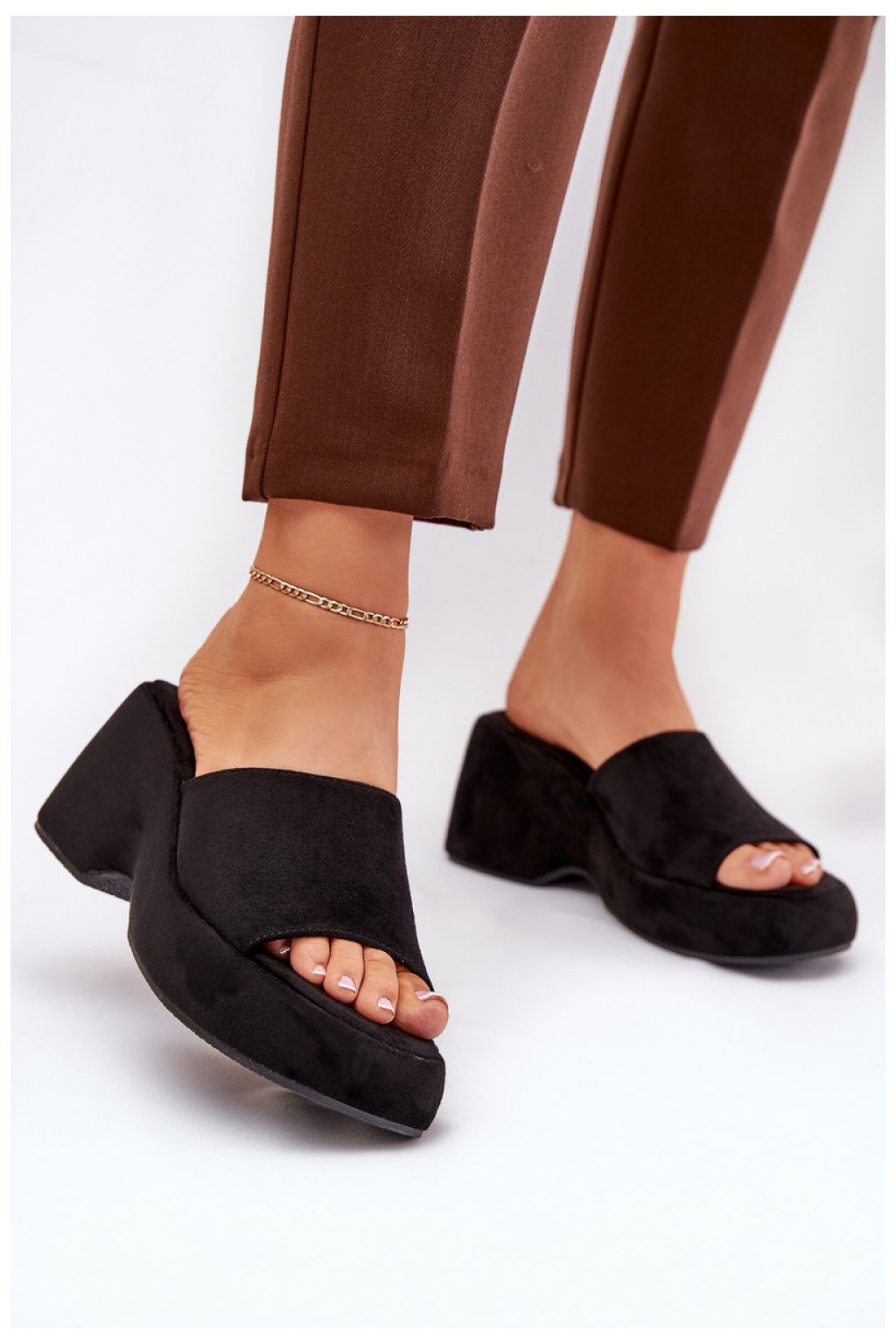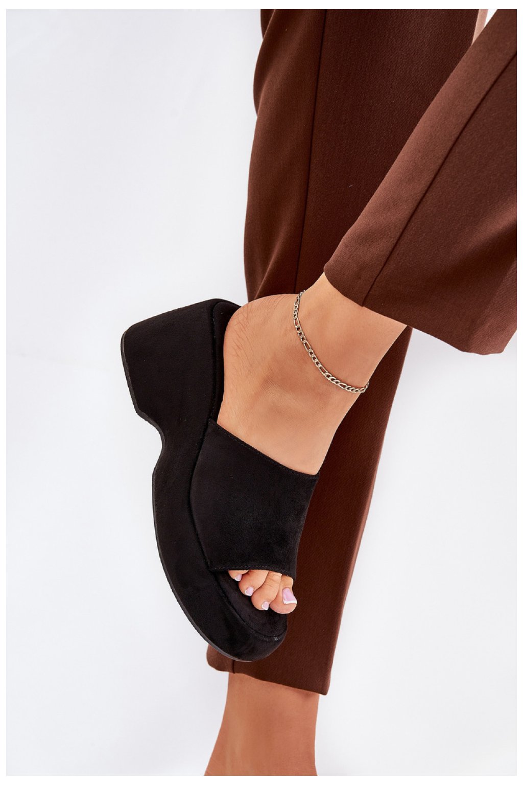 Dámské pantofle vyrobené z eko semiše, usazené na platformě a klínu, které spojují styl s pohodlím. Měkká stélka zajišťuje pohodlí po celý den. Ideální k lehkým šatům, kalhotám a na různé akce, tyto pantofle představují vynikající doplněk mnoha letních stylizací, dodávající lehkost a eleganci.