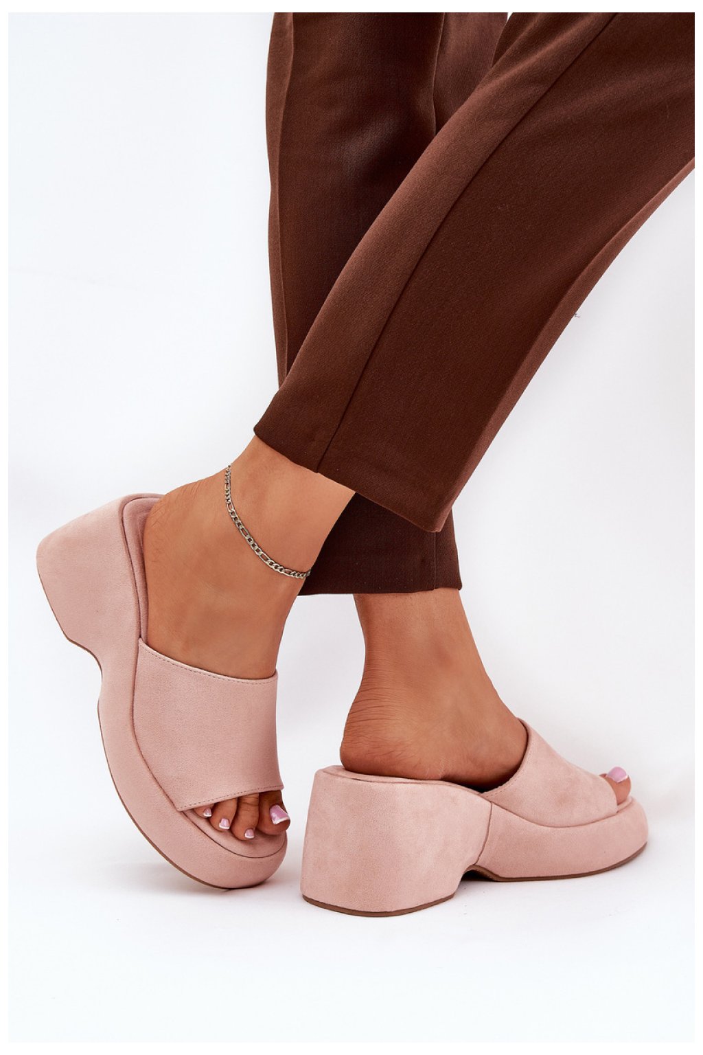 Dámské pantofle vyrobené z eko semiše, usazeny na platformě a klínu, které spojují styl s pohodlím. Měkká vložka zajišťuje komfort po celý den. Ideální k lehkým šatům, látkovým kalhotám a na různé příležitosti, tyto pantofle představují dokonalý doplněk mnoha letních stylizací, dodávající lehkost a eleganci.
