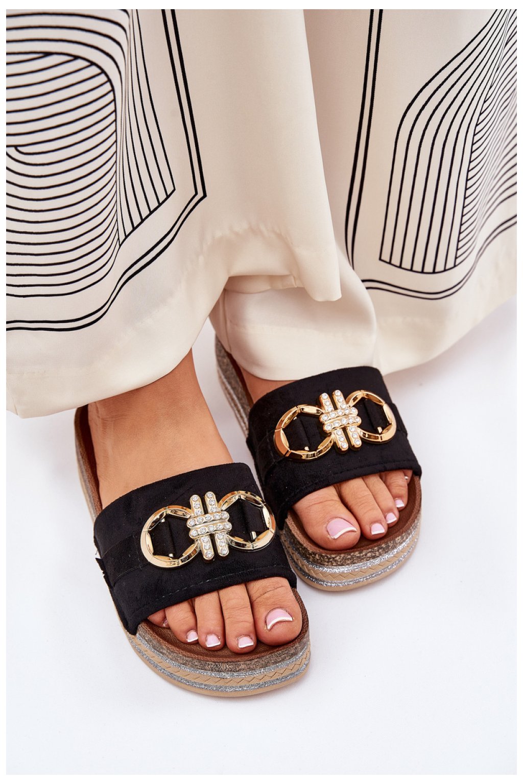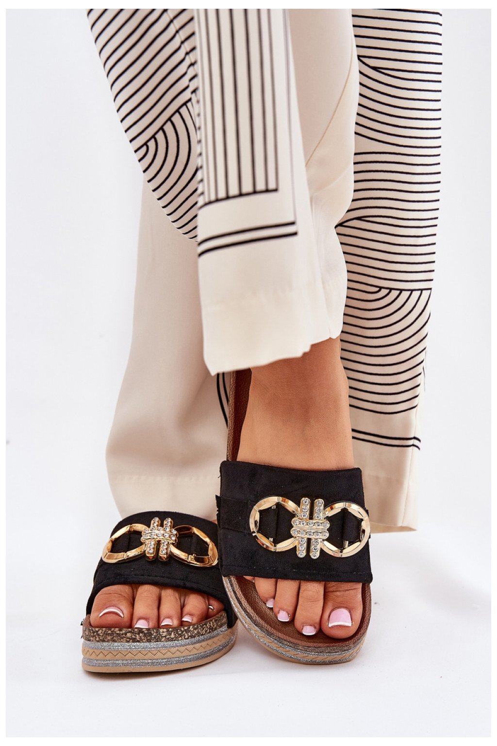 Střevíce vyrobené z ekologického semiše. Přední část zdobí efektní zlatý prvek, který jim dodává jedinečný charakter. Umístěné na platformě s broskvovým zpracováním přinášejí do každého outfitu skvělý lesk. Tyto střevíce jsou ideální volbou na letní dny, skvěle se kombinují s šaty, sukněmi nebo kraťasy, dodávají každému outfitu moderní styl.