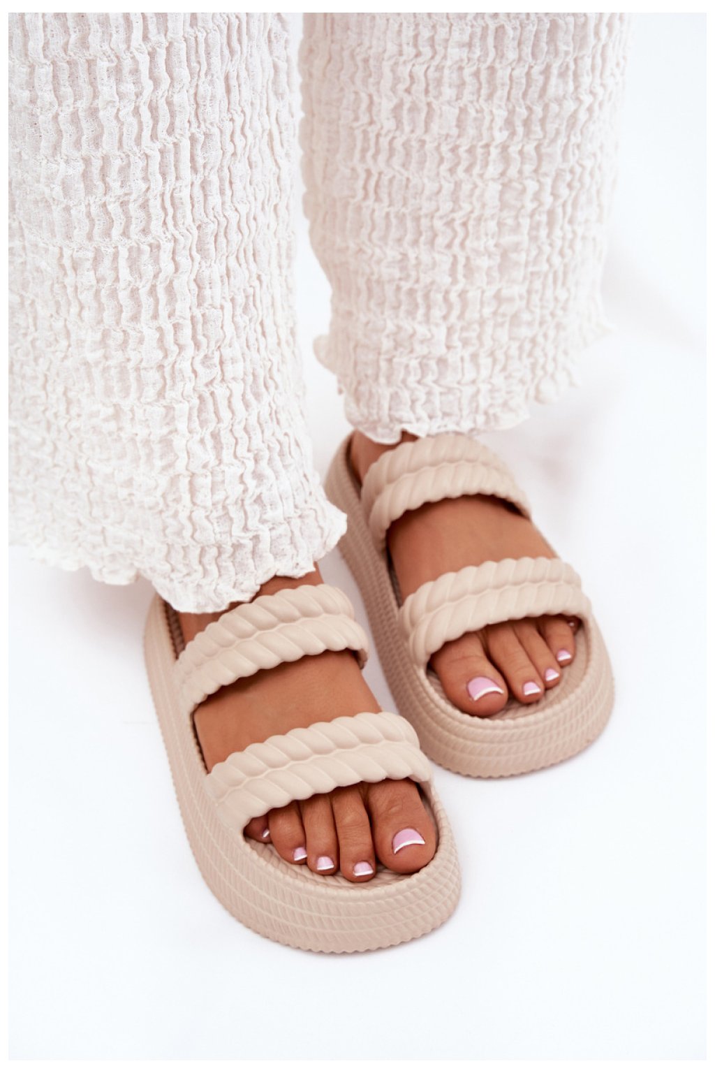 Dámské pantofle vyrobené z lehké pěnové látky, umístěné na platformě, které nabízejí pohodlí po celý den. Dva popruhy vpředu zajišťují stabilitu a jistotu při chůzi. Ideální na horké dny, tyto pantofle jsou skvělou volbou na dovolenou, čas u bazénu nebo na pláži, spojující funkčnost s pohodlím.