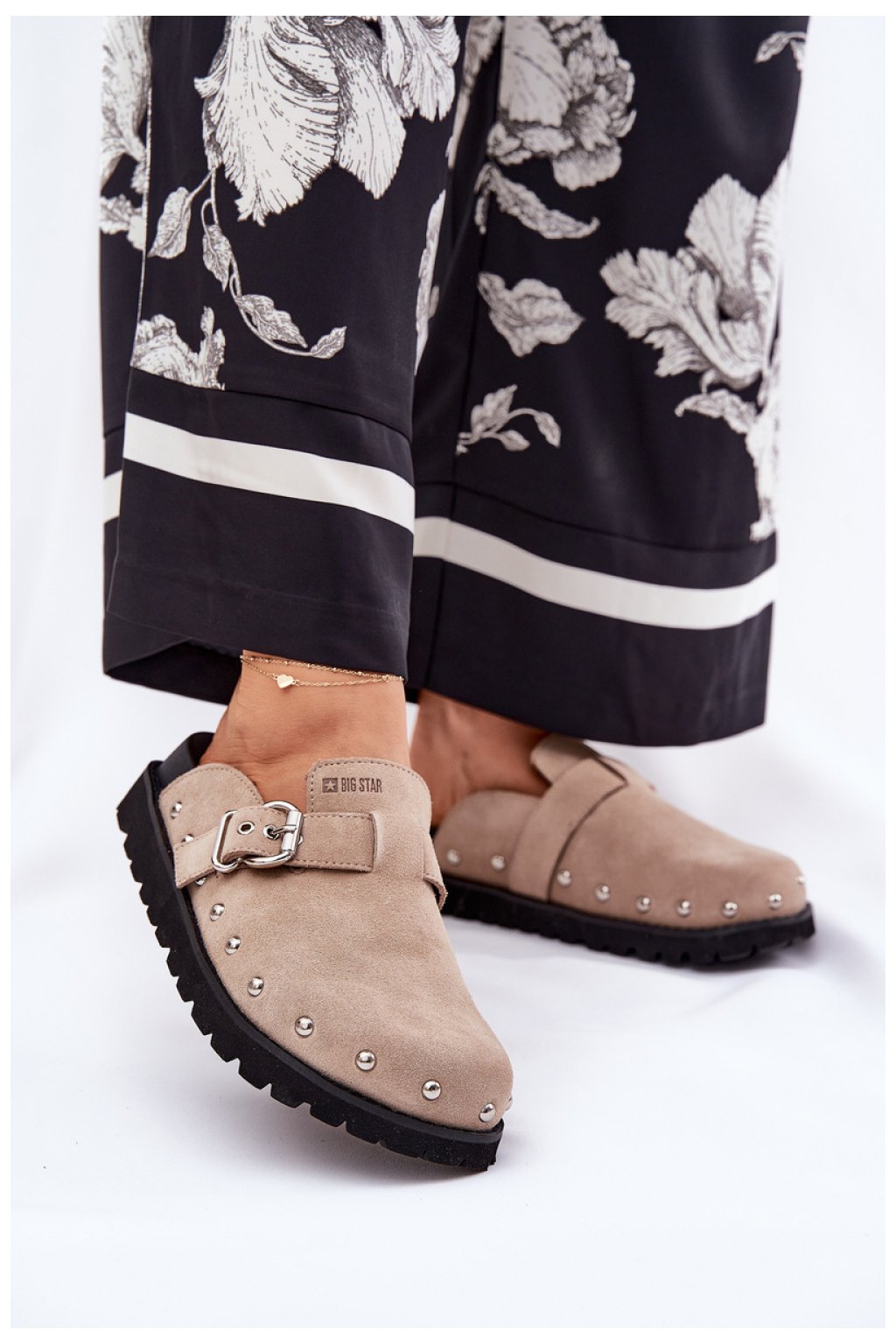 Žabky dámské značky Big Star. Vyrobena z přírodního semiše, stylý výběr pro každý den. Umístěné na platformě, poskytují stabilitu a pohodlí po celý den. Ozdobené hřebíčky, vpředu pásek s přezkou, dodávají výjimečný charakter. Špičky jsou zakryté, široké a zaoblené, co zaručuje pohodlí. Tyto žabky jsou skvělým výběrem pro mnoho letních outfitů.
