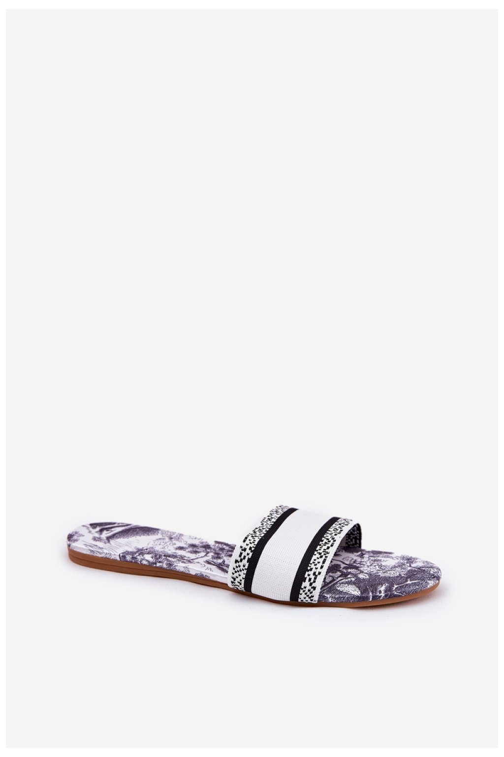 Ploché dámské pantofle vyrobené z textilního materiálu, které se vyznačují unikátním vzorem, dodávajícím jim výjimečný charakter. Tyto pantofle jsou ideální na teplé dny, skvěle se hodí k letním šatům, sukním nebo kraťasům, přinášejí lehkost, barvu a módní akcent do každodenních stylizací. Ideální jak na pláž, tak na procházky po městě.