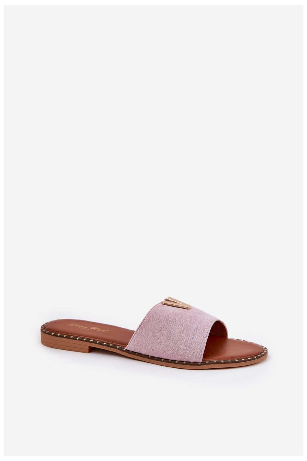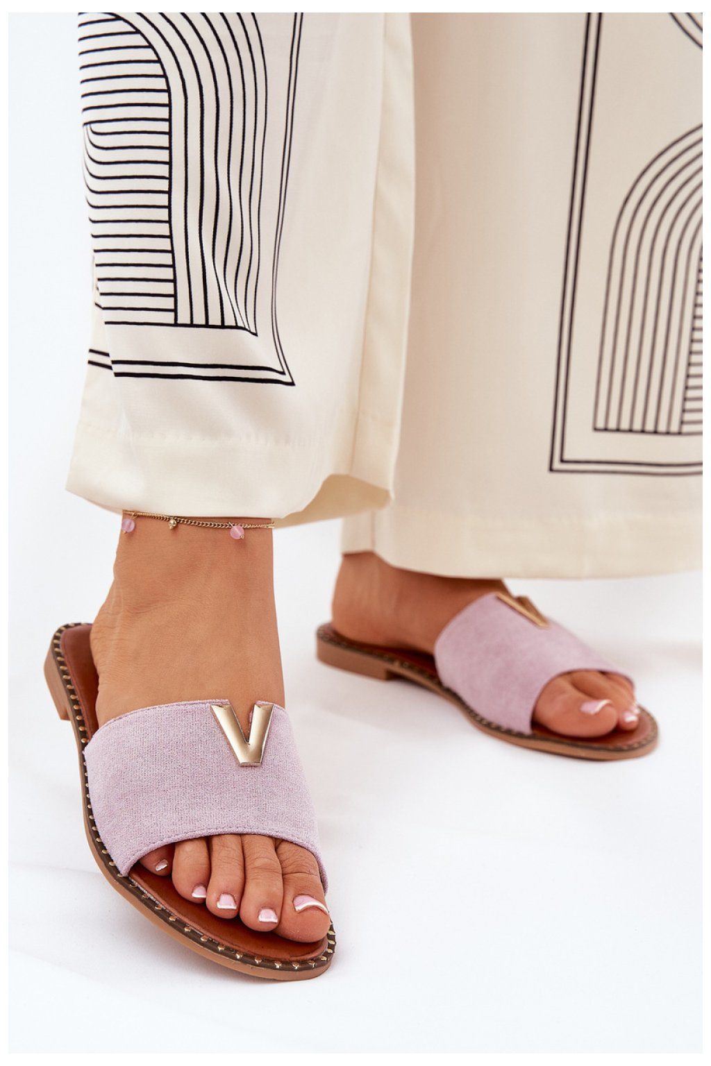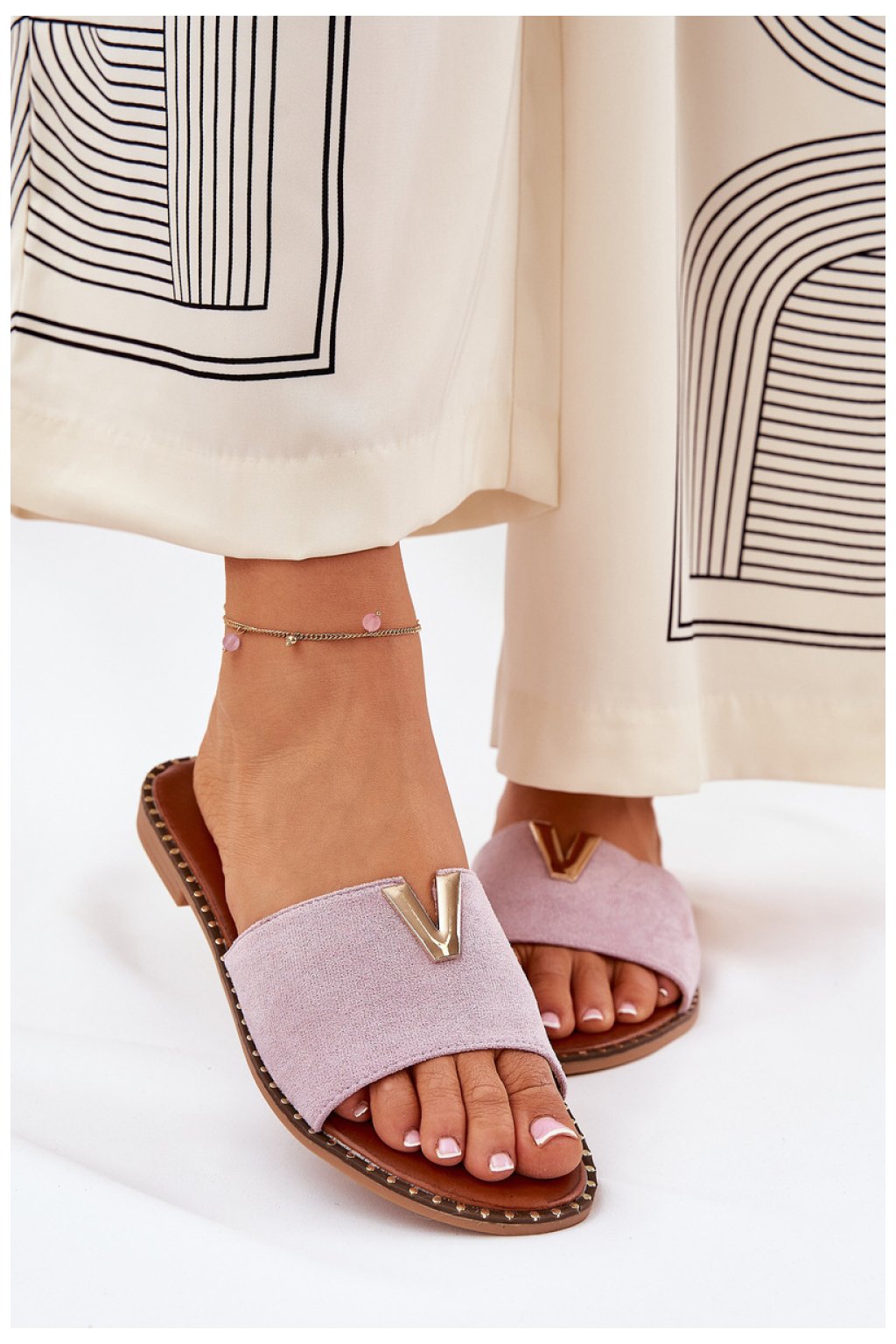 Dámské sandály na ploché podrážce jsou ideální volbou na letní dny. Vyrobené z příjemného na dotek eko semiše, zajistí pohodlí při nošení. Klasický střih byl obohacen o dekorativní detaily, které jim dodávají elegantní charakter. Skvěle se hodí jak na každý den, tak na letní procházky. Skvěle ladí s šaty, sukněmi a kalhotami, dodávají stylizaci stylový akcent.
