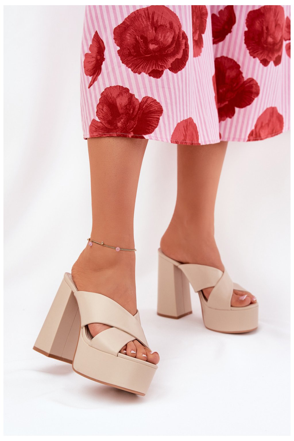 Dámské sandály vyrobené z ekokože. Vepředu dva se křížící řemínky. Umístěné na vysokém sloupku a platformě, zajistí pohodlí a stabilitu, zároveň přidávají lehkost postavě. Ideální na letní dny, tyto sandály skvěle ladí s šaty, sukněmi a kalhotami.