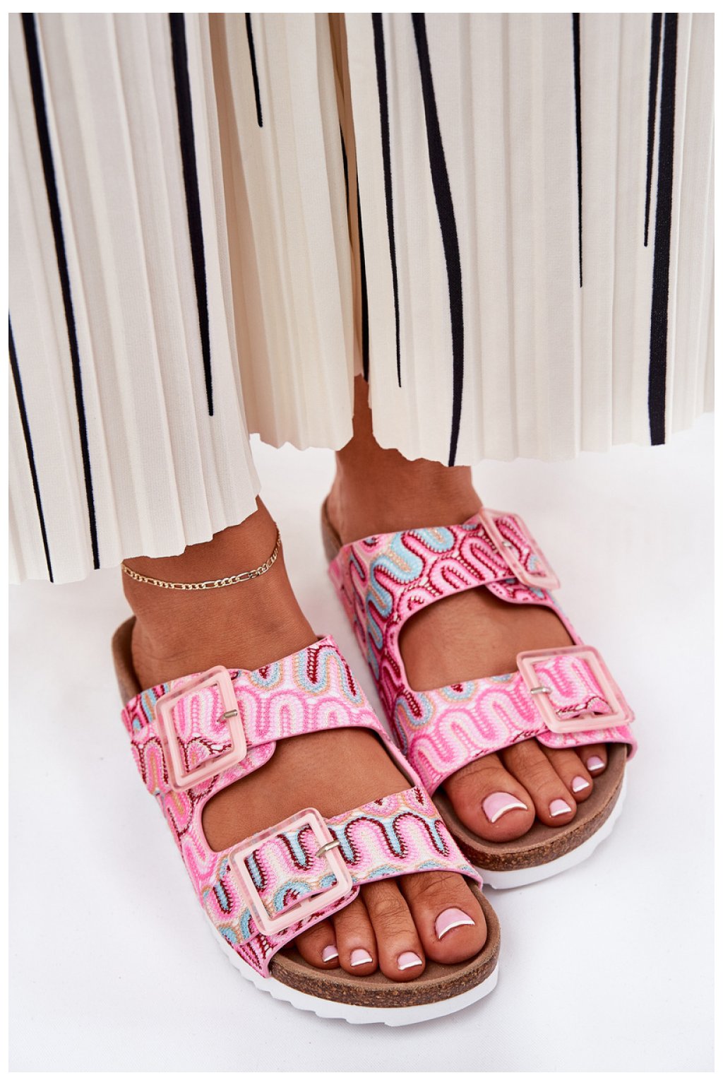 Vzorované dámské žabky z textilního materiálu, umístěné na korkové platformě, které spojují pohodlí s módním vzhledem. Dva popruhy s přezkami zdobenými flitry jim dodávají výjimečný charakter. Profilovaná semišová stélka zaručuje pohodlí po celý den. Tyto žabky budou skvělou volbou na letní dny, skvěle ladící s šaty, sukněmi nebo šortkami, vnášejíc do každého outfitu lehkost a lesk.