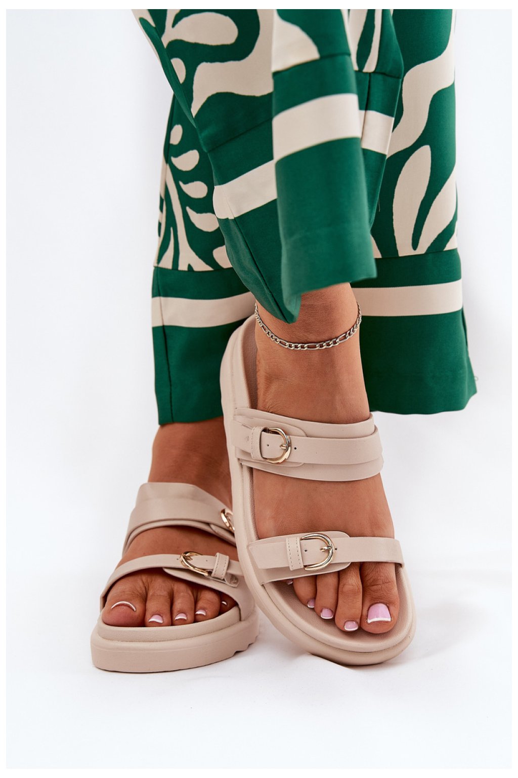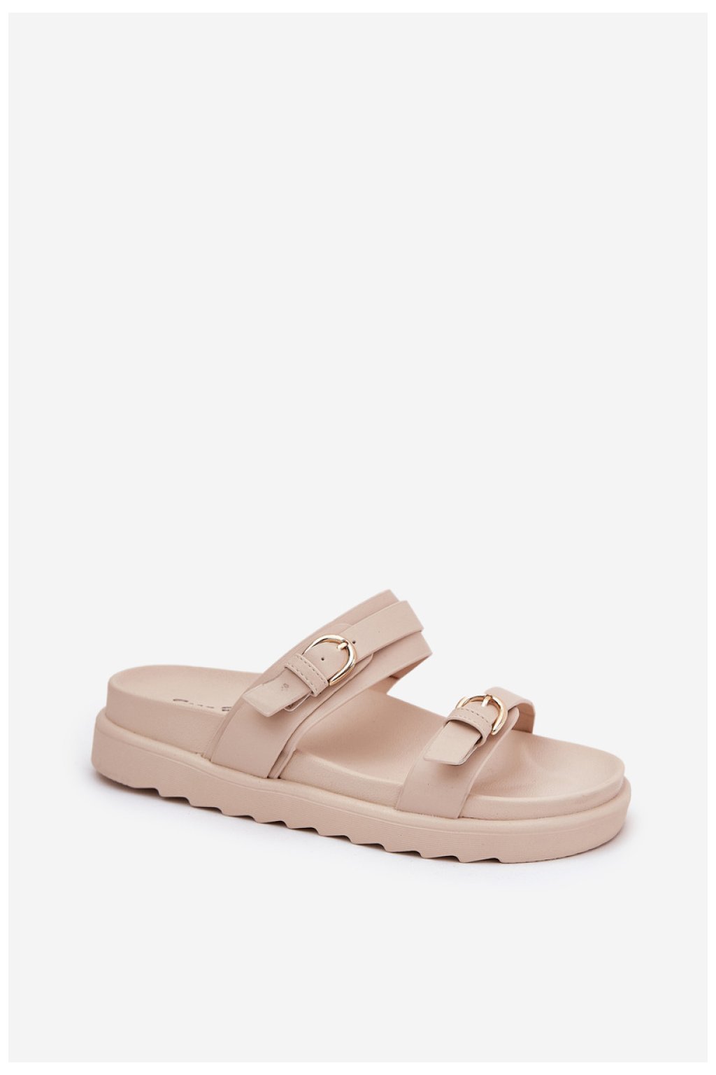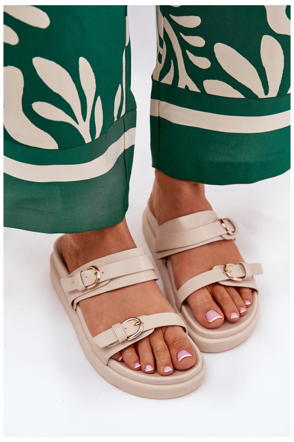 Stylové dámské pantofle na platformě, které harmonicky spojují komfort s moderním vzhledem. Přední část pantoflů má dva pásky s přezkami, což jim dodává charakter a jemně přitahuje pozornost. Platforma zaručuje jistotu kroku a stabilitu po celý den. Dokonalé na každodenní nošení, skvěle se hodí jak k šatům, tak k kalhotám, a představují všestranný prvek každého letního šatníku.