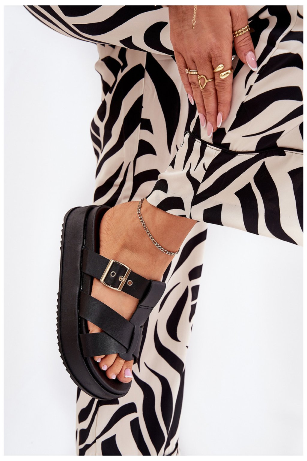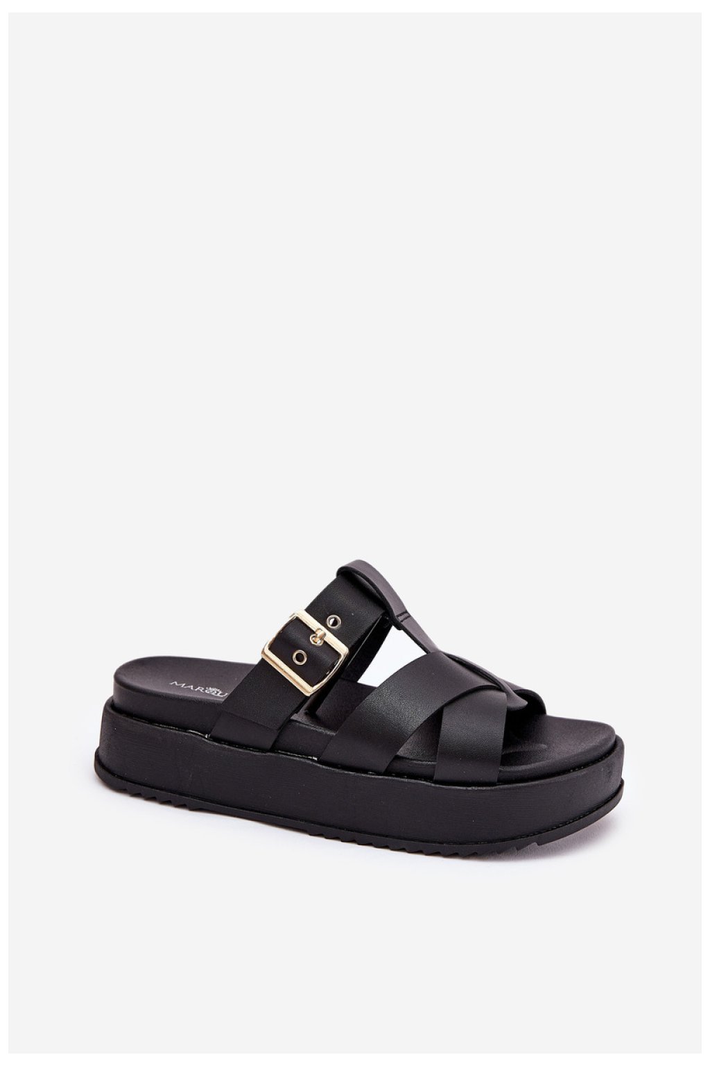 Dámské pantofle vyrobené z eko kůže, které spojují pohodlí s módním vzhledem. Usazené na platformě, zajišťují správnou výšku, zároveň dodávají postavě lehkost. Vpředu jsou boty ozdobeny pásky a přezkou. Ideální na letní dny, skvěle se hodí jak k každodenním, tak k elegantnějším stylizacím, poskytující komfort na každém kroku.
