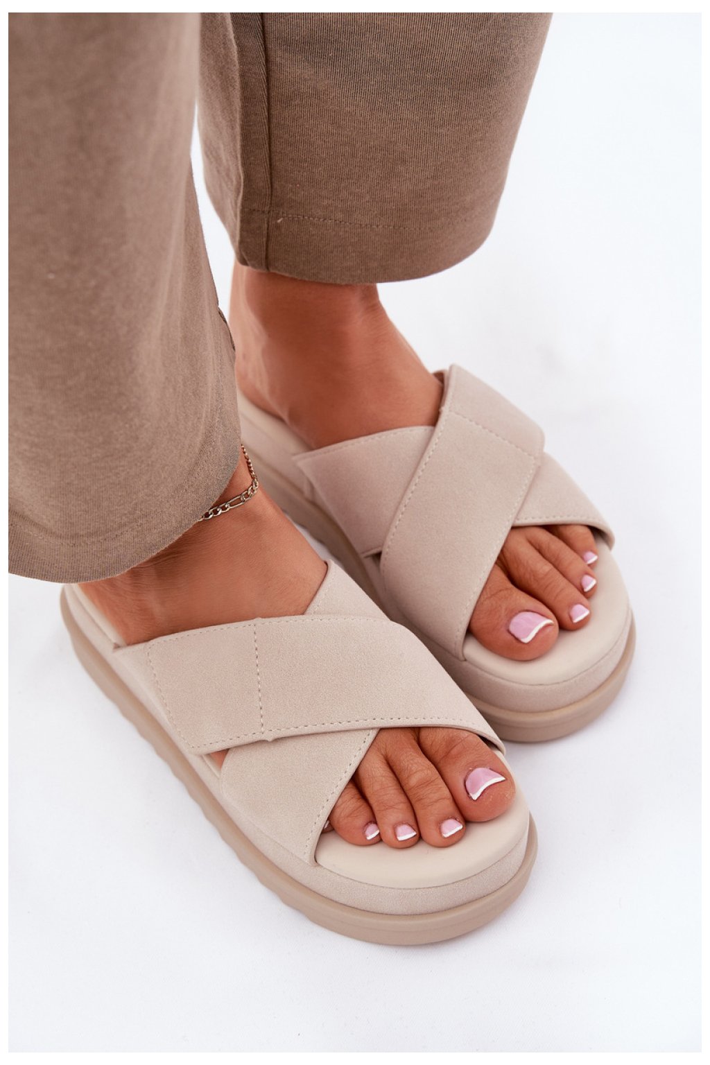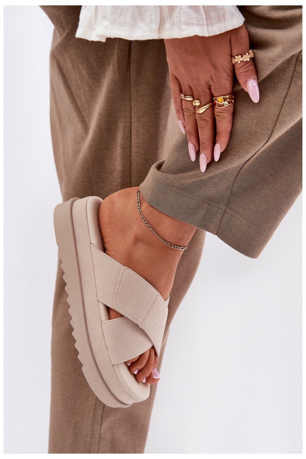 Dámské žabky vyrobené z ekologického semiše jsou skvělým návrhem na teplé dny. Umístěné na platformě poskytují pohodlí a stabilitu po celý den. Vepředu jsou dva zkřížené popruhy, z nichž jeden má suchý zip, umožňující snadné přizpůsobení noze. Tyto žabky spojují pohodlí s moderním vzhledem, ideální pro letní styling.