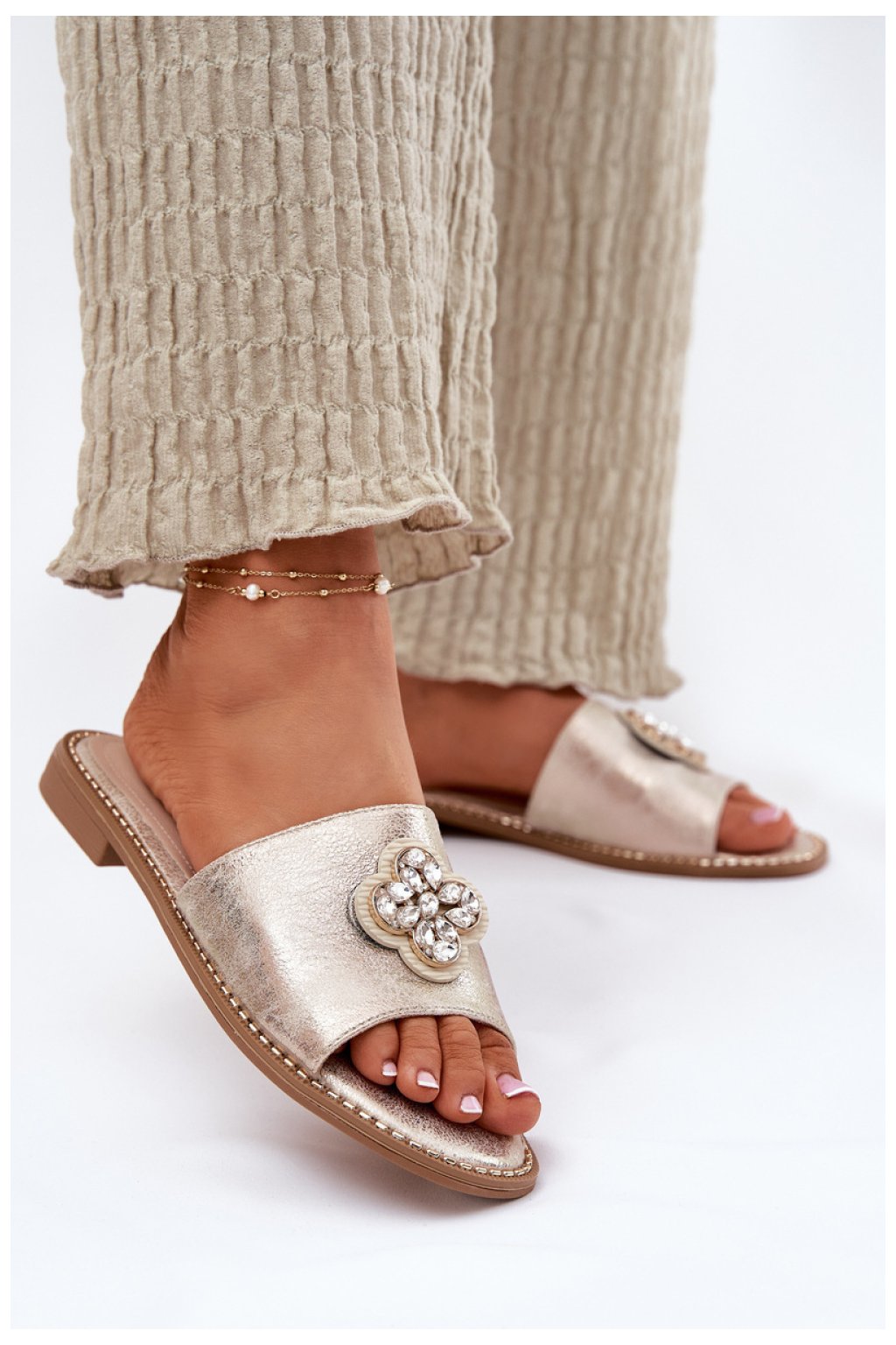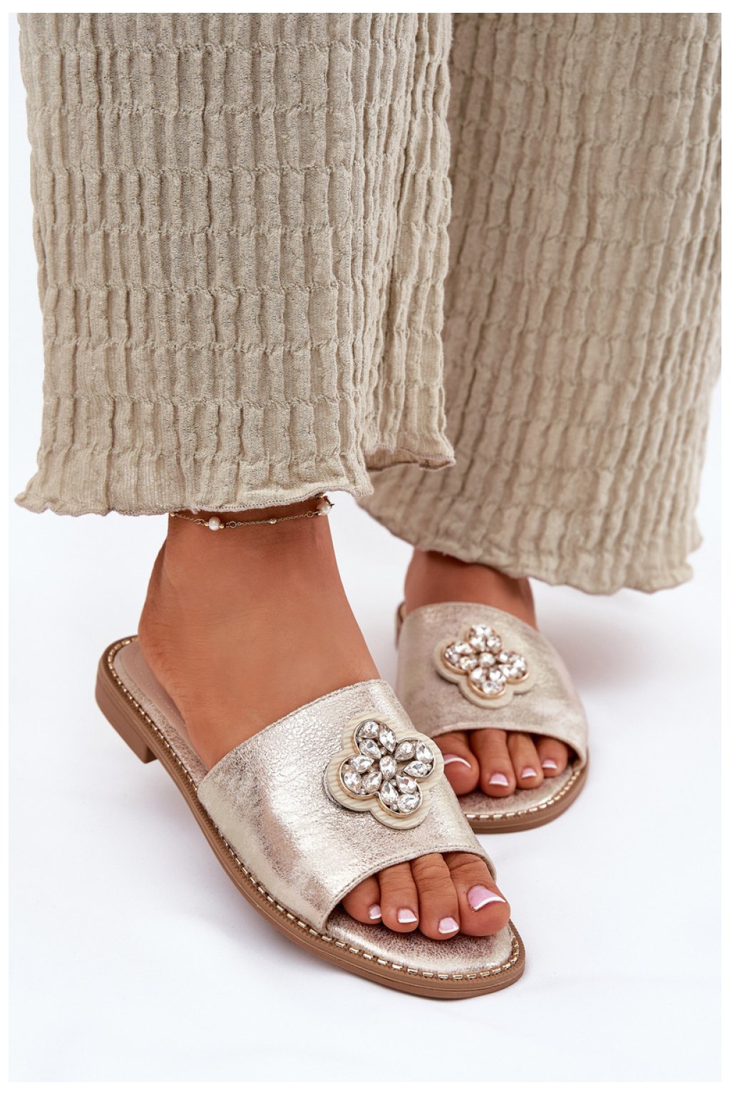 Elegantní dámské sandály vyrobené z vysoce kvalitní ekokože jsou skvělou volbou na teplé dny. Díky nízké podrážce nabízejí pohodlí a stabilitu po celý den. Kůžená stélka zajišťuje pohodlí a správnou ventilaci, co oceníte zejména během horkých dní. Jemná ozdoba vpředu dodává výjimečný kouzlo, spojuje eleganci s moderním stylem. Tyto sandály budou skvělým doplňkem jak každodenních, tak formálních stylizací, skvěle ladící k letním outfitům.