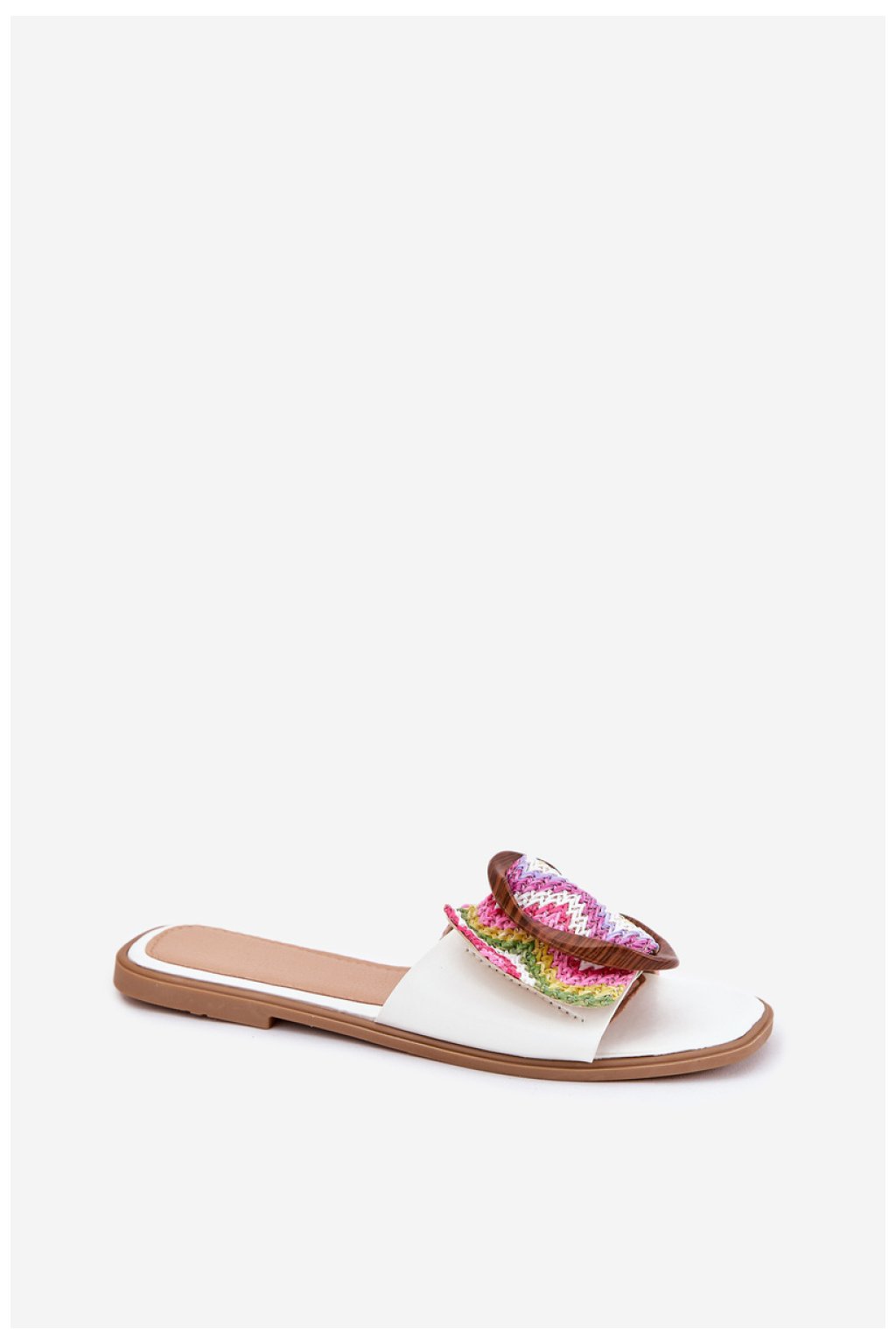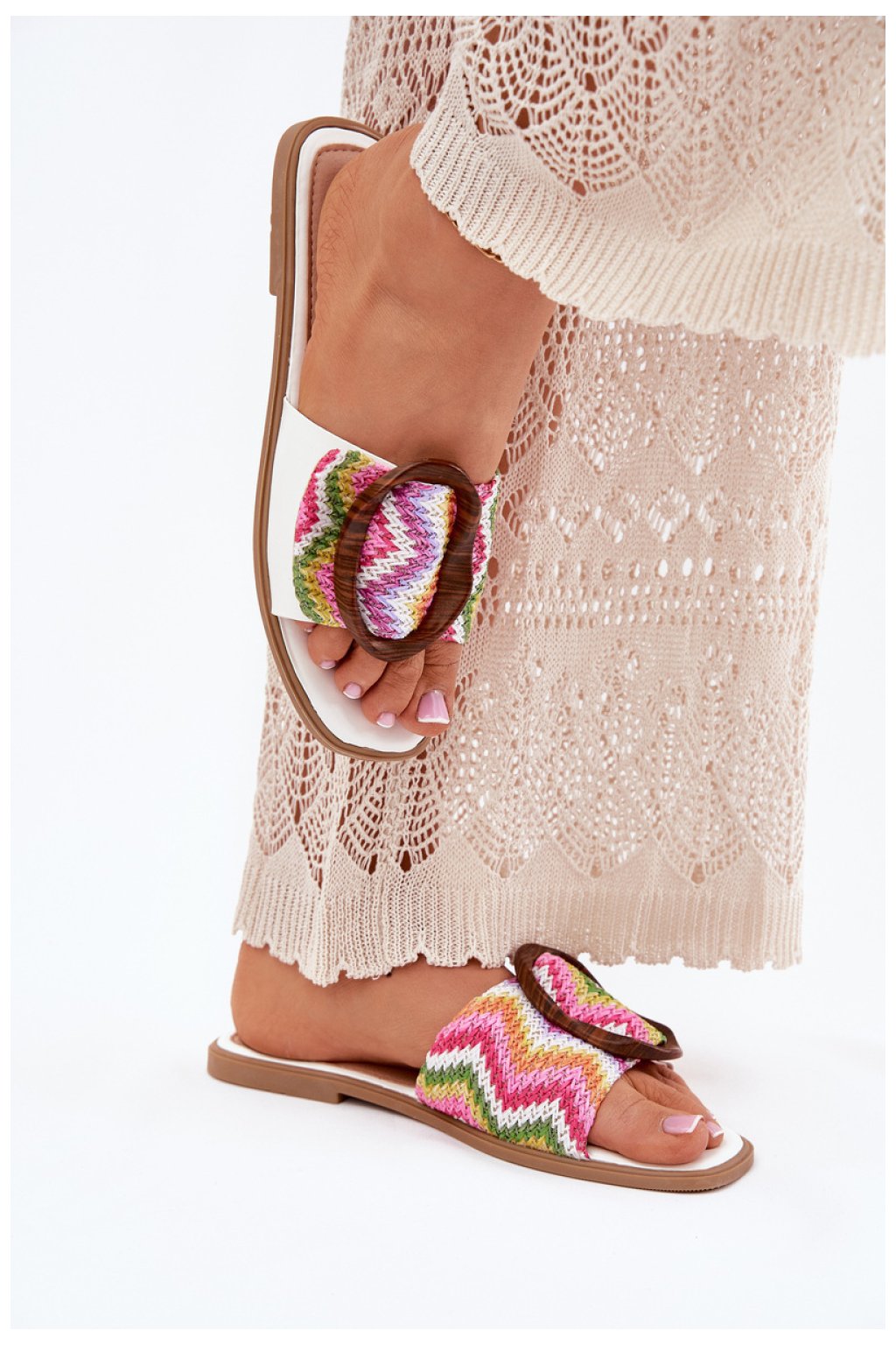 Dámské sandály z ekokože na ploché podrážce jsou stylovou a pohodlnou volbou na každý den. Tento model se vyznačuje proužkem se spletením, který jim dodává jemný šarm, a ozdobnou sponou, která přitahuje pozornost. Ideální pro letní outfit!