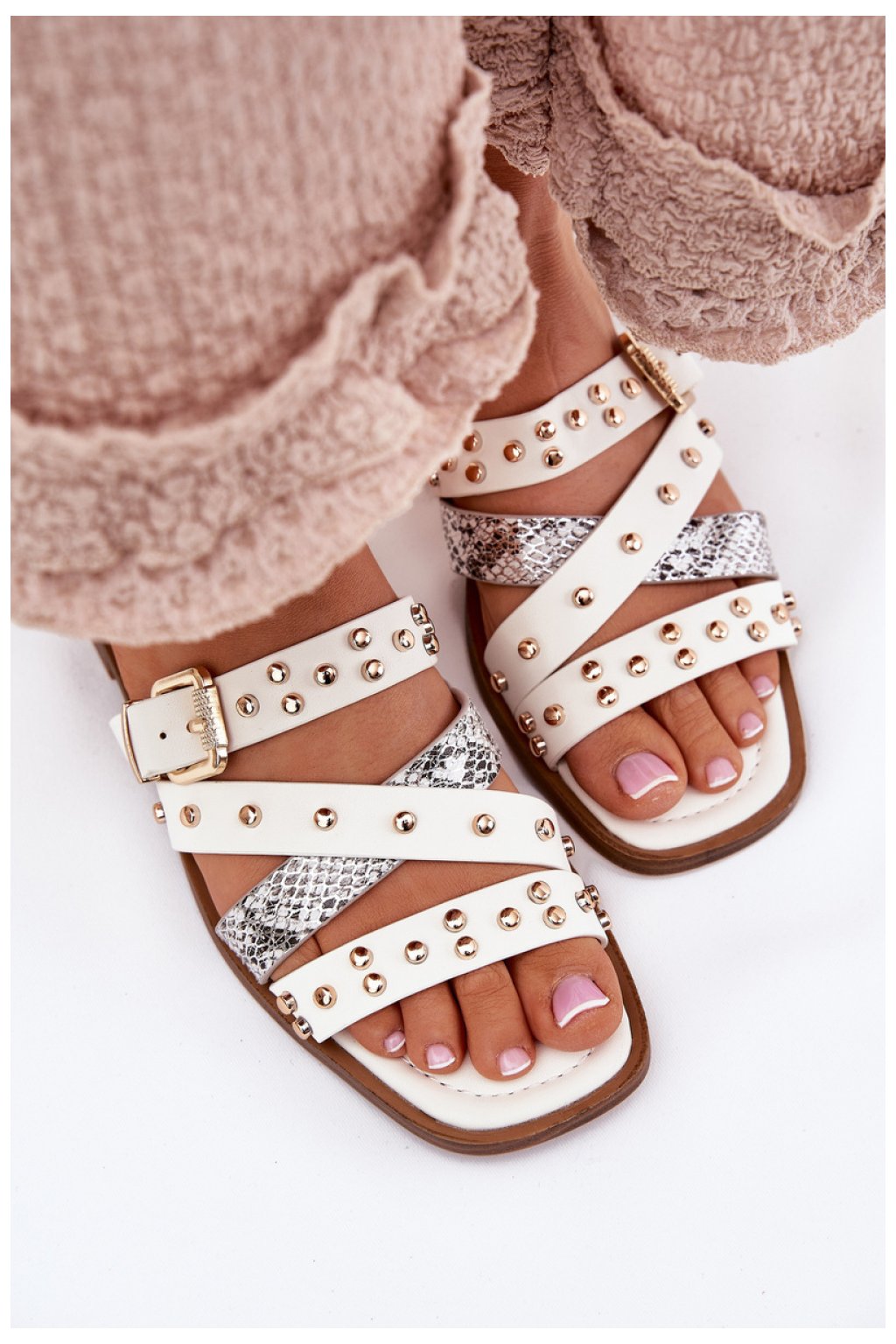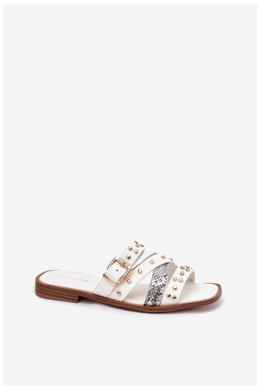 Dámské pantofle vyrobené z ekokože. Umístěné na plochém podpatku. Model se vyznačuje decentním zdobením, sponou a pásky, které jim dodávají moderní charakter. Skvěle se hodí k každodenním outfitům, spojují pohodlí s trendy vzhledem, ideální na letní procházky nebo neformální výlety.