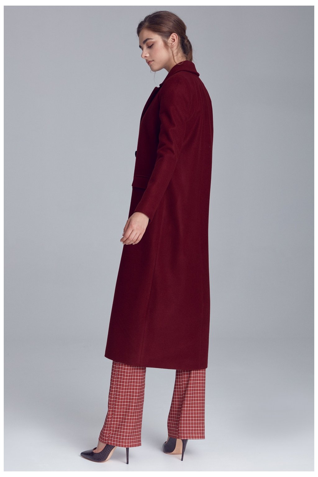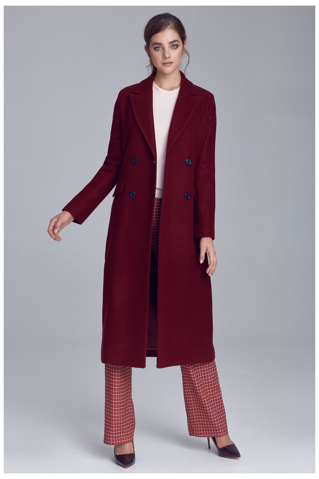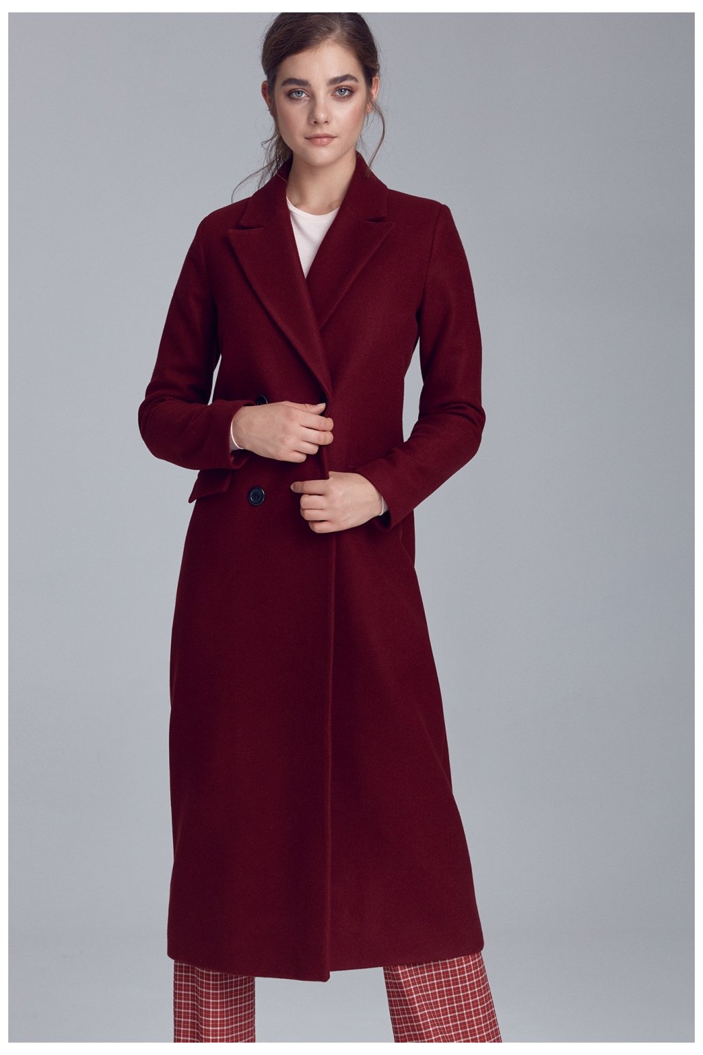 Elegantní, teplý, dlouhý kabát z měkkého materiálu s příměsí vlny. Skvěle doplní každý podzimní styling. Jednoduchý, nadčasový střih se hodí k oficiálnímu i neformálnímu oblečení. Kabát má dvouřadové zapínání, klasický límec a kapsy.