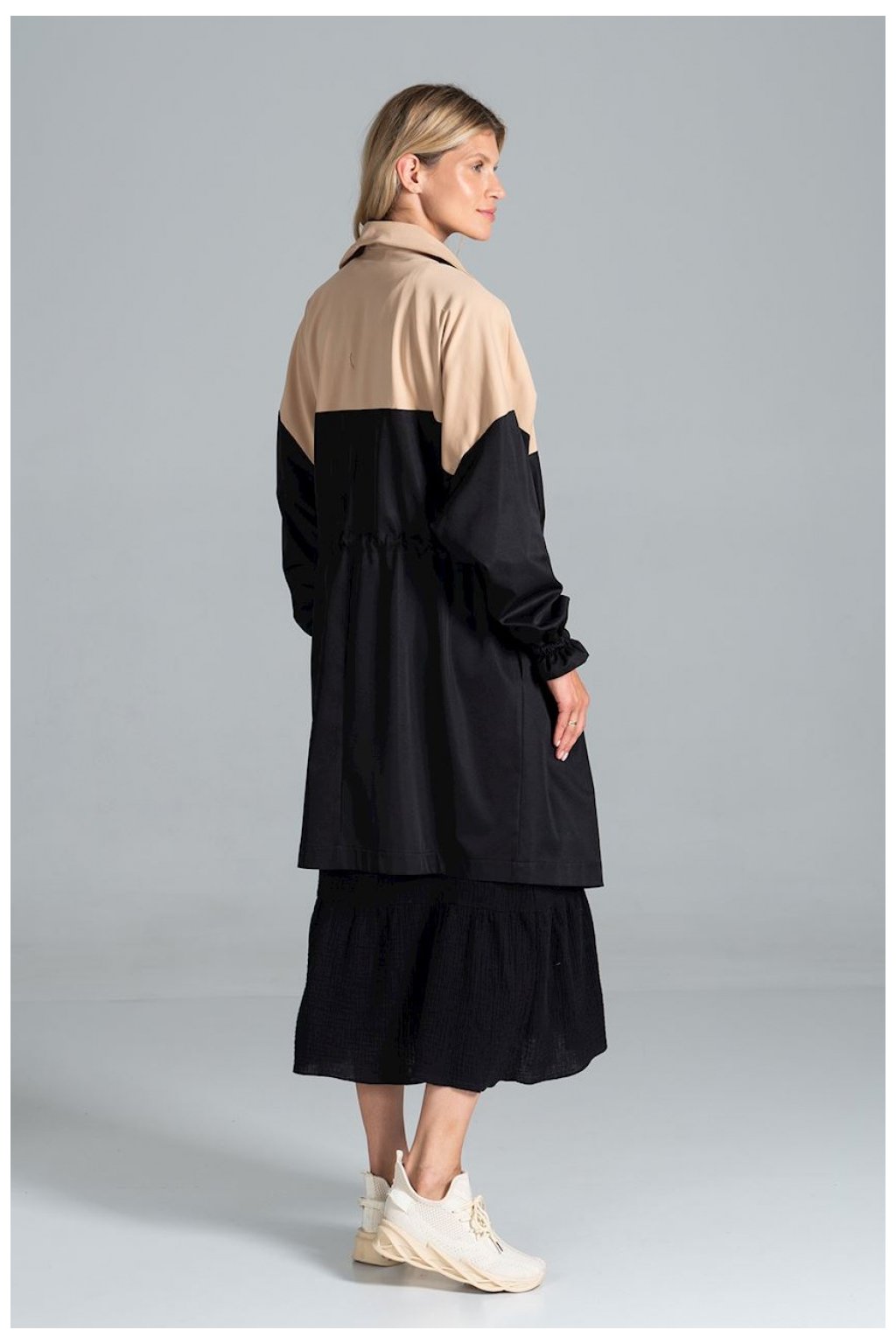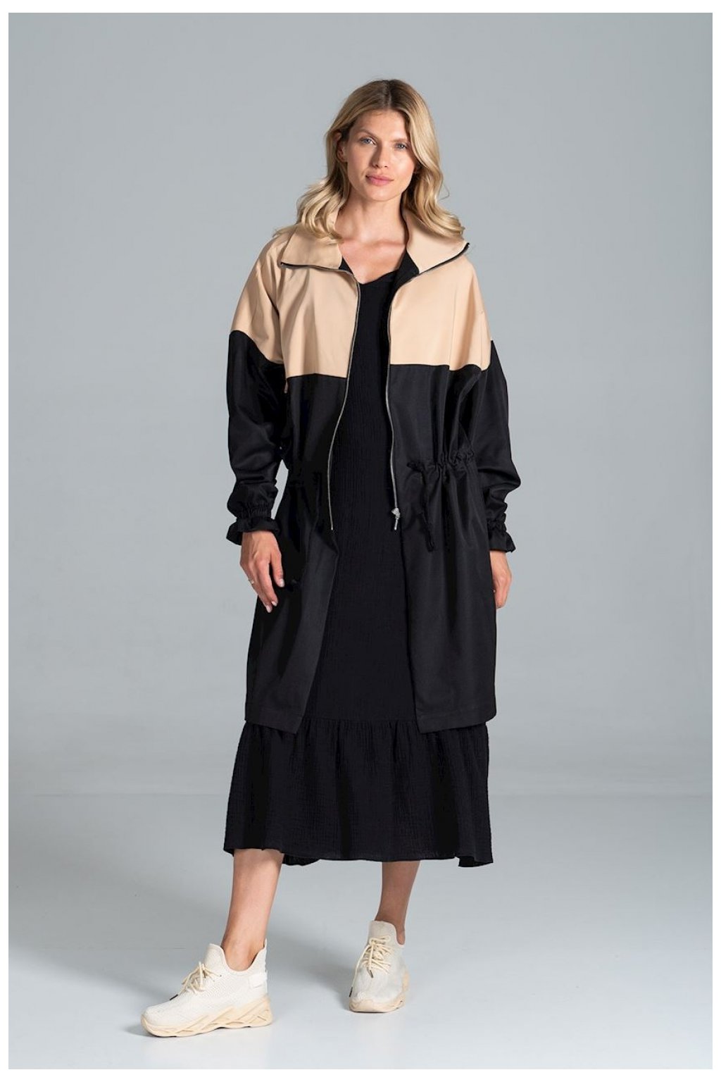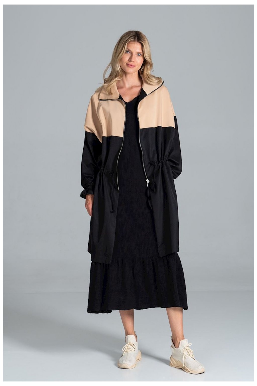 Dvoubarevný podzimní kabát typu parka, částečně zapínaný na zip, s límcem, v pase navíc stahovací šňůrka, rukávy nařasené všitou gumou, kapsy v bočních švech, bez podšívky.