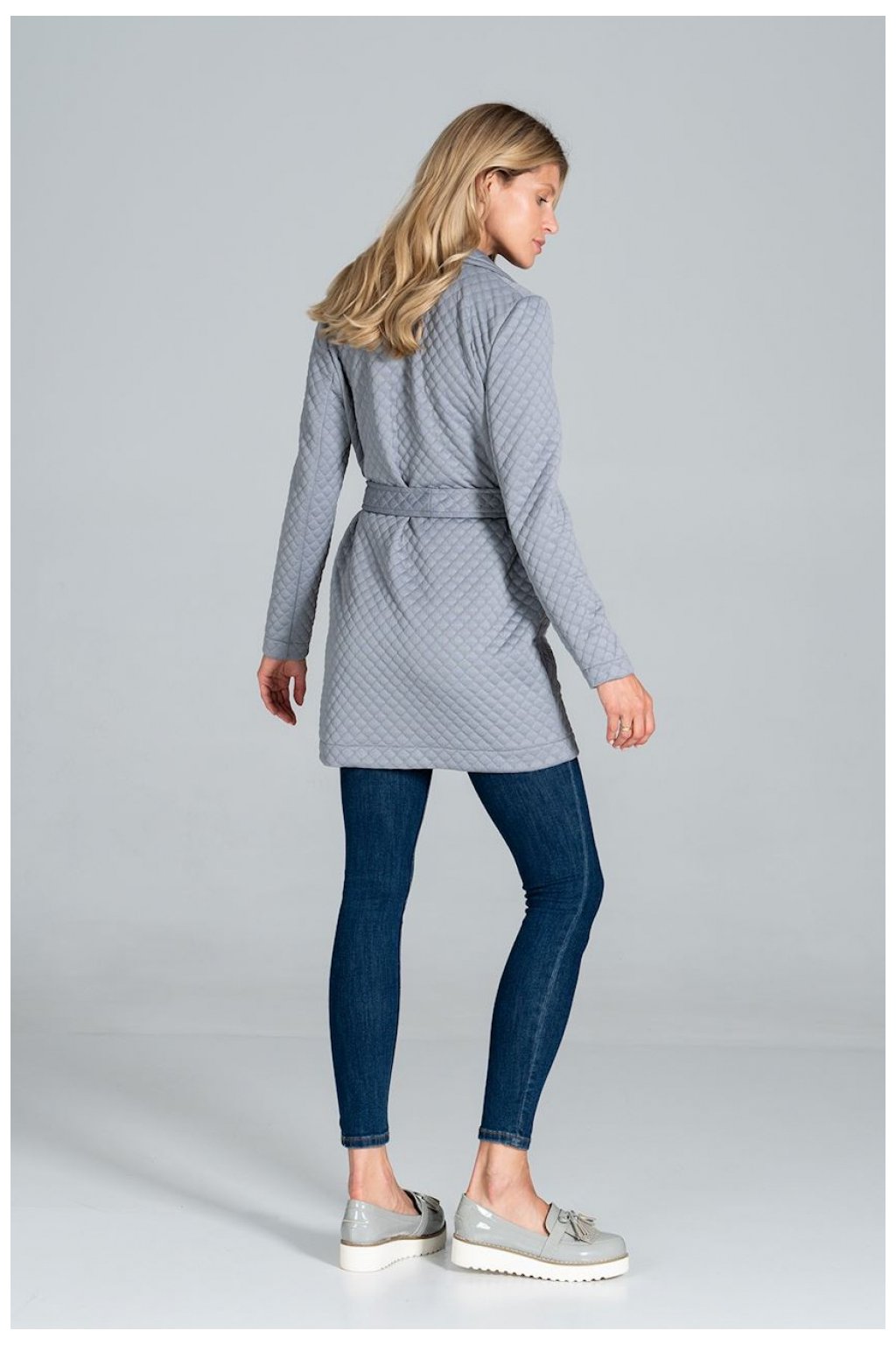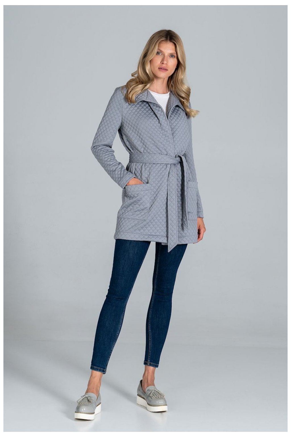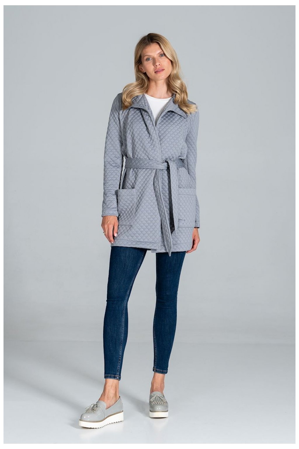 Krátký prošívaný kabát, rozepínací, zavazuje se páskem, má límec, vpředu kapsy s nášivkami, bez podšívky.