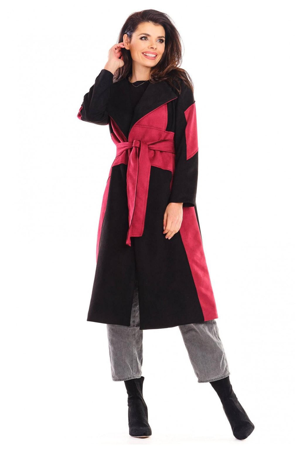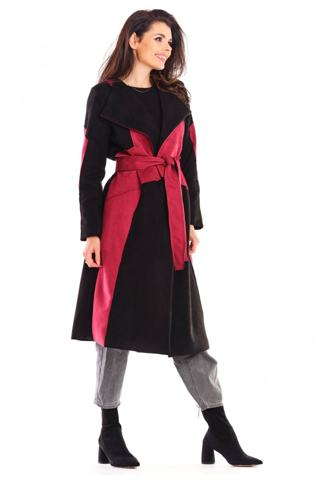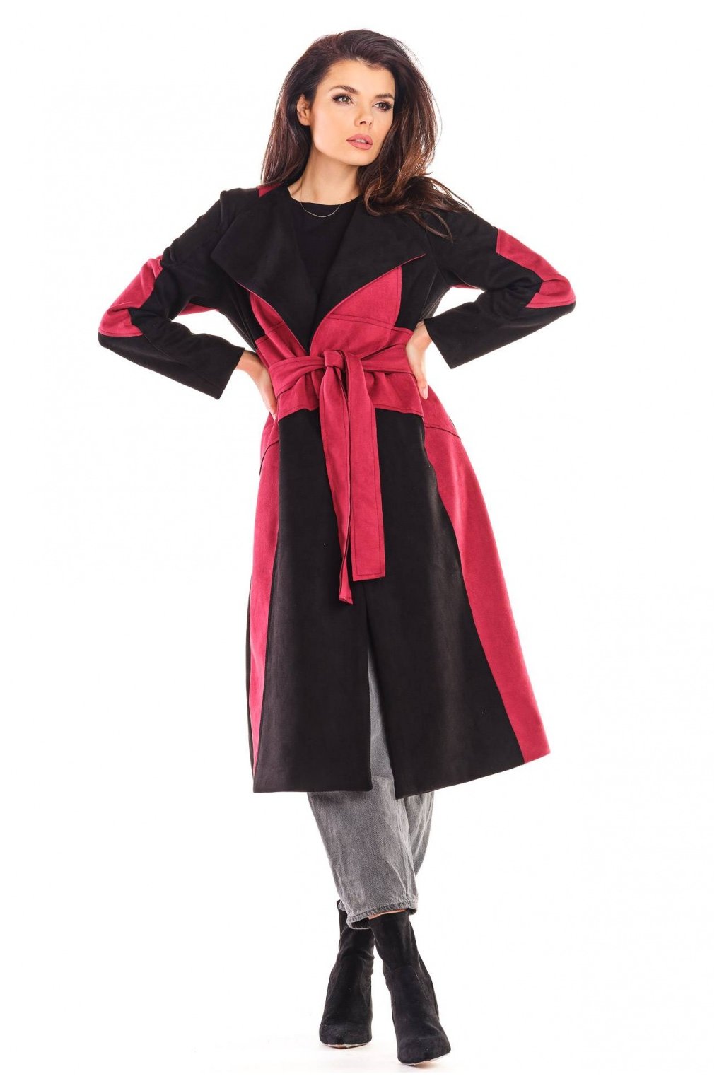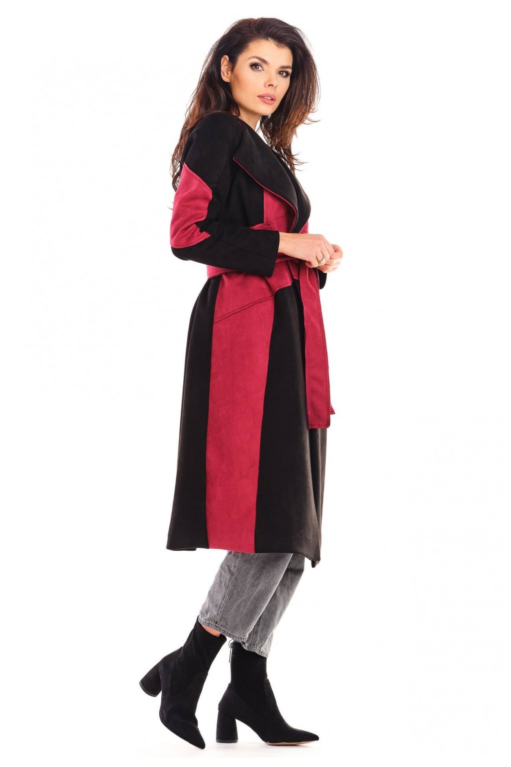 Delší dámský kabát ze semiše. Kabát je vyroben z módní kombinace barev v podzimních barvách. Nemá zapínání, ale má přídavný pásek, takže si ho můžete zavázat v pase a zdůraznit svůj pas. Hodí se k elegantnímu i ležérnímu oblečení. Vyrobeno v Polsku.
