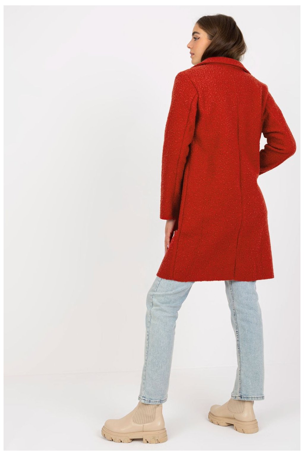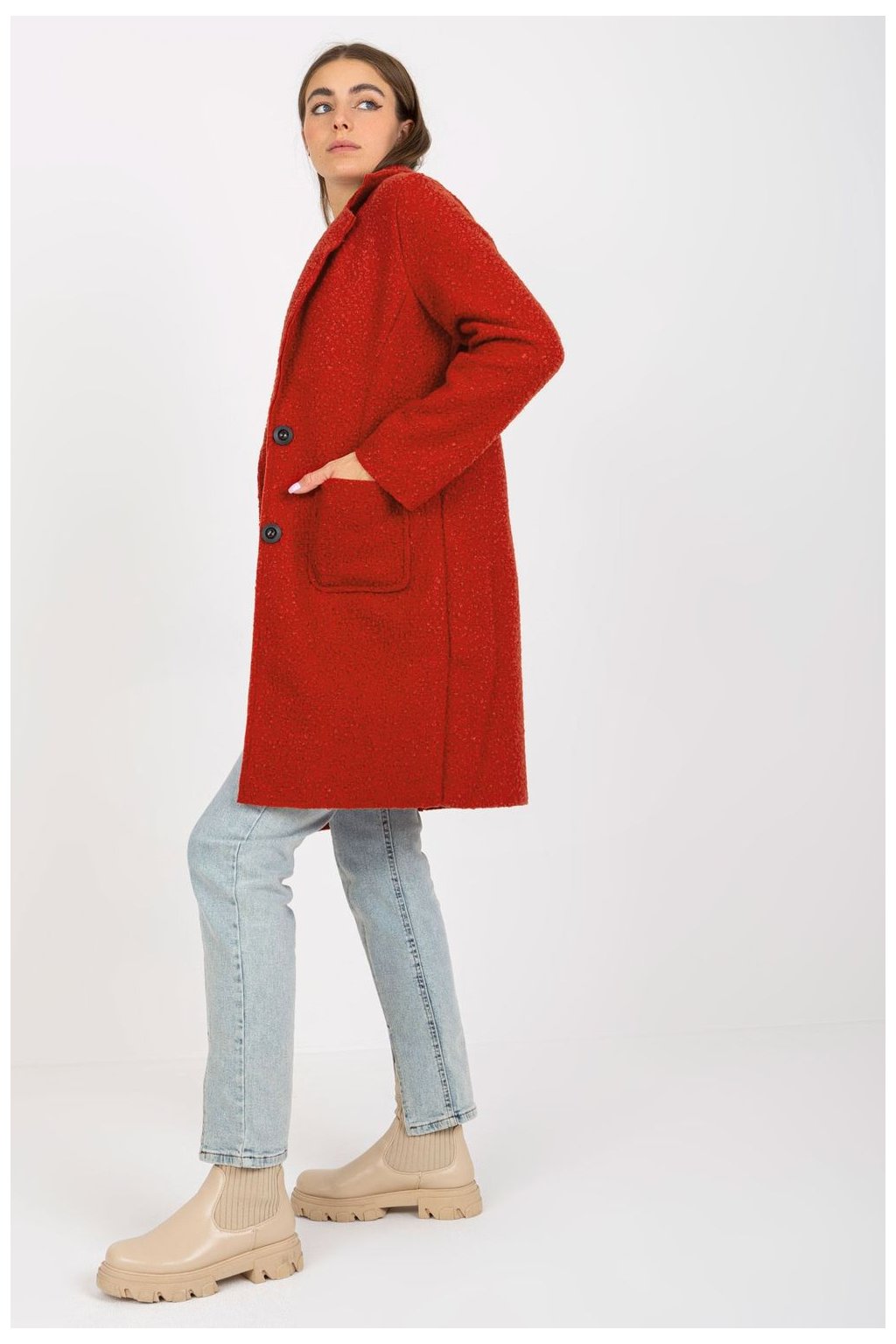 Dámský kabát s dlouhými rukávy a nakládanými kapsami. Kabát bez podšívky se zapínáním na knoflíky.