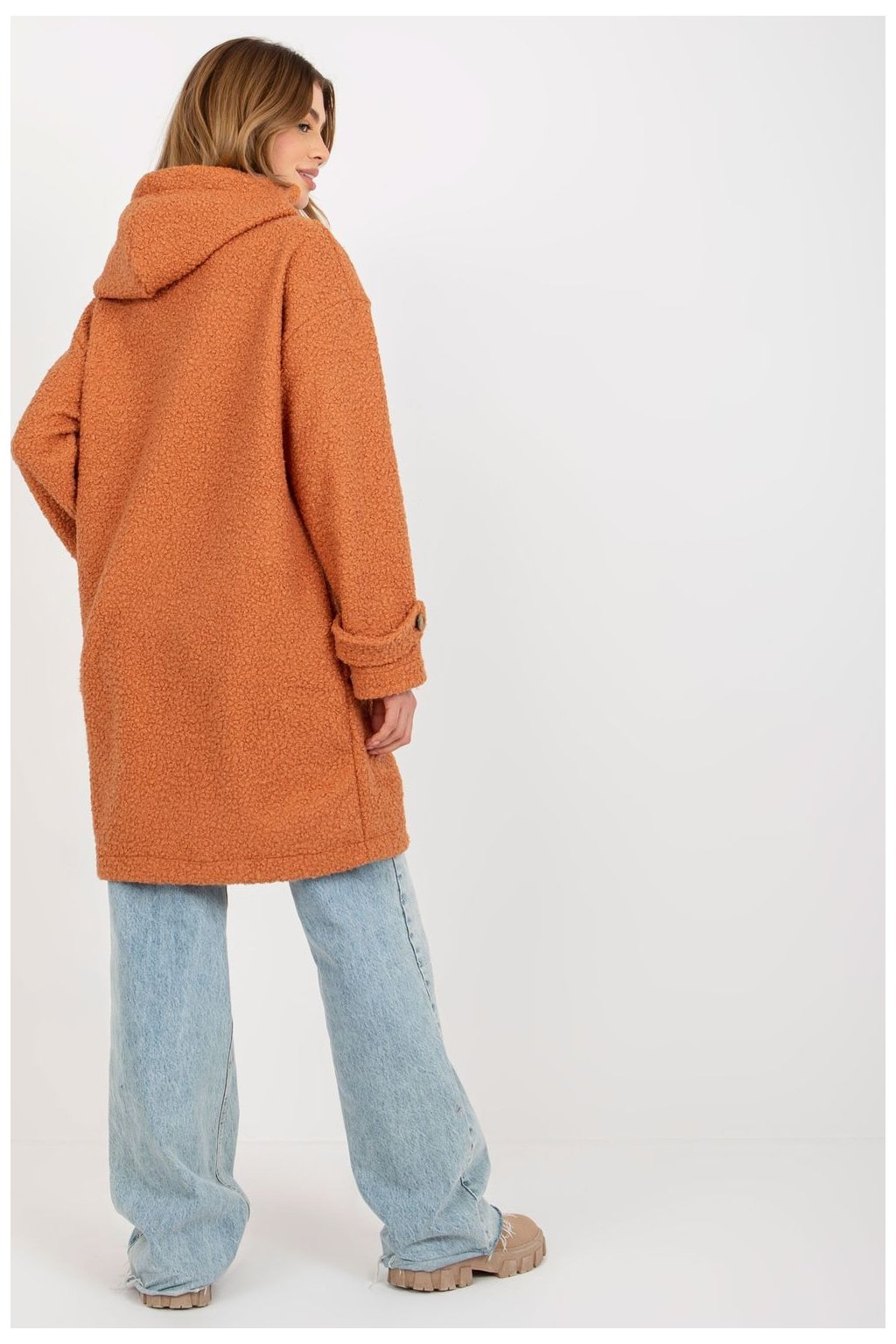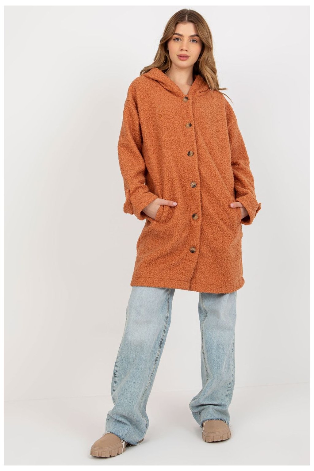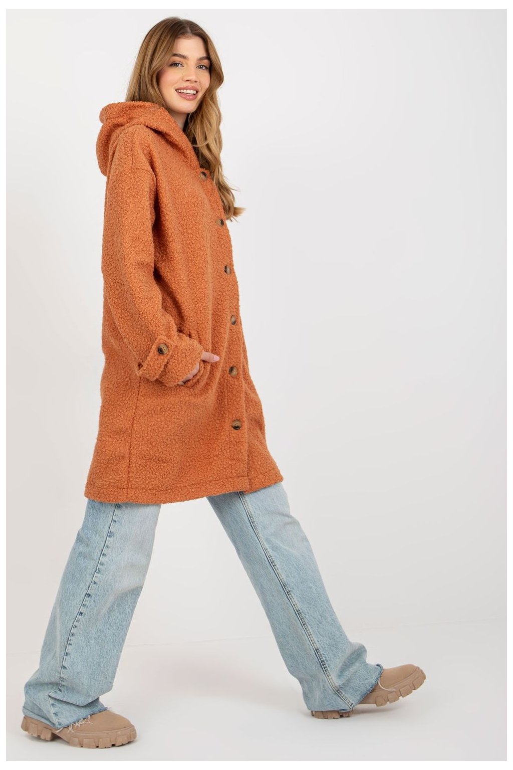 Plyšový kabát s dlouhými rukávy a zapínáním na knoflíky. Kabát s kapucí a nakládanými kapsami. Kabát bez podšívky a bez izolace.