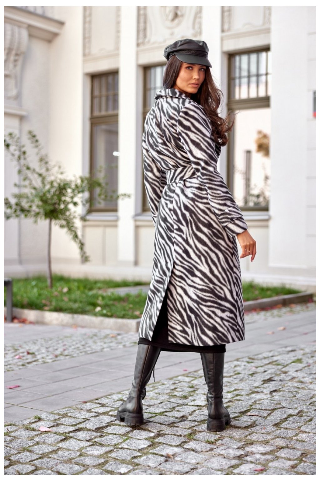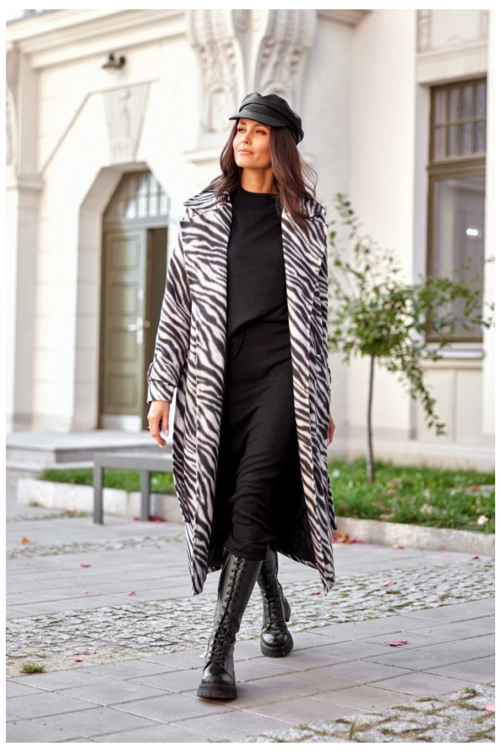 Dlouhý rovný dámský kabát s dlouhými rukávy, který překypuje elegancí a nekonvenčností, je na konci obohacen ozdobnými pruhy v barvě kabátu. Kabát má pásek na zavazování v pase a velmi působivý límec mu dodává na půvabu. Kabát má na bocích praktické kapsy a vzadu na spodním okraji rozparek pro větší volnost pohybu. Kabát je podšitý. Kabát bez kapuce s nakládanými kapsami na úrovni boků bude ideální pro podzimní a zimní ochlazení. Velmi originální návrh pro každodenní nošení, k džínům, sukni, ale také ideální pro elegantní outfit. Výrobek je vyroben a ušit v Polsku.