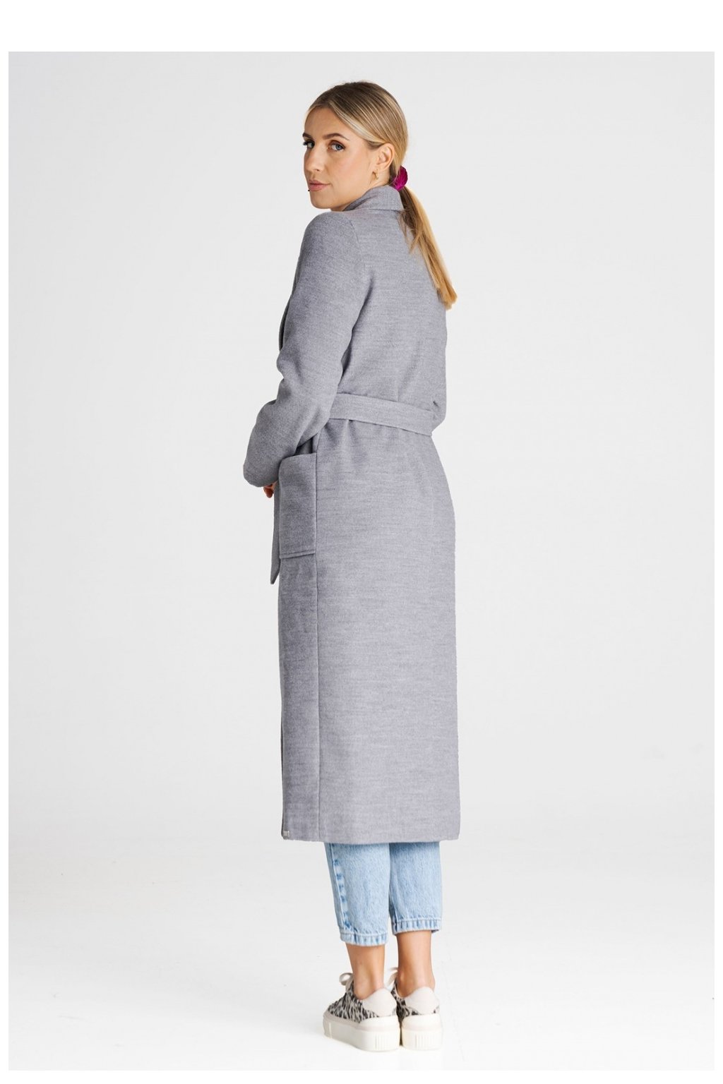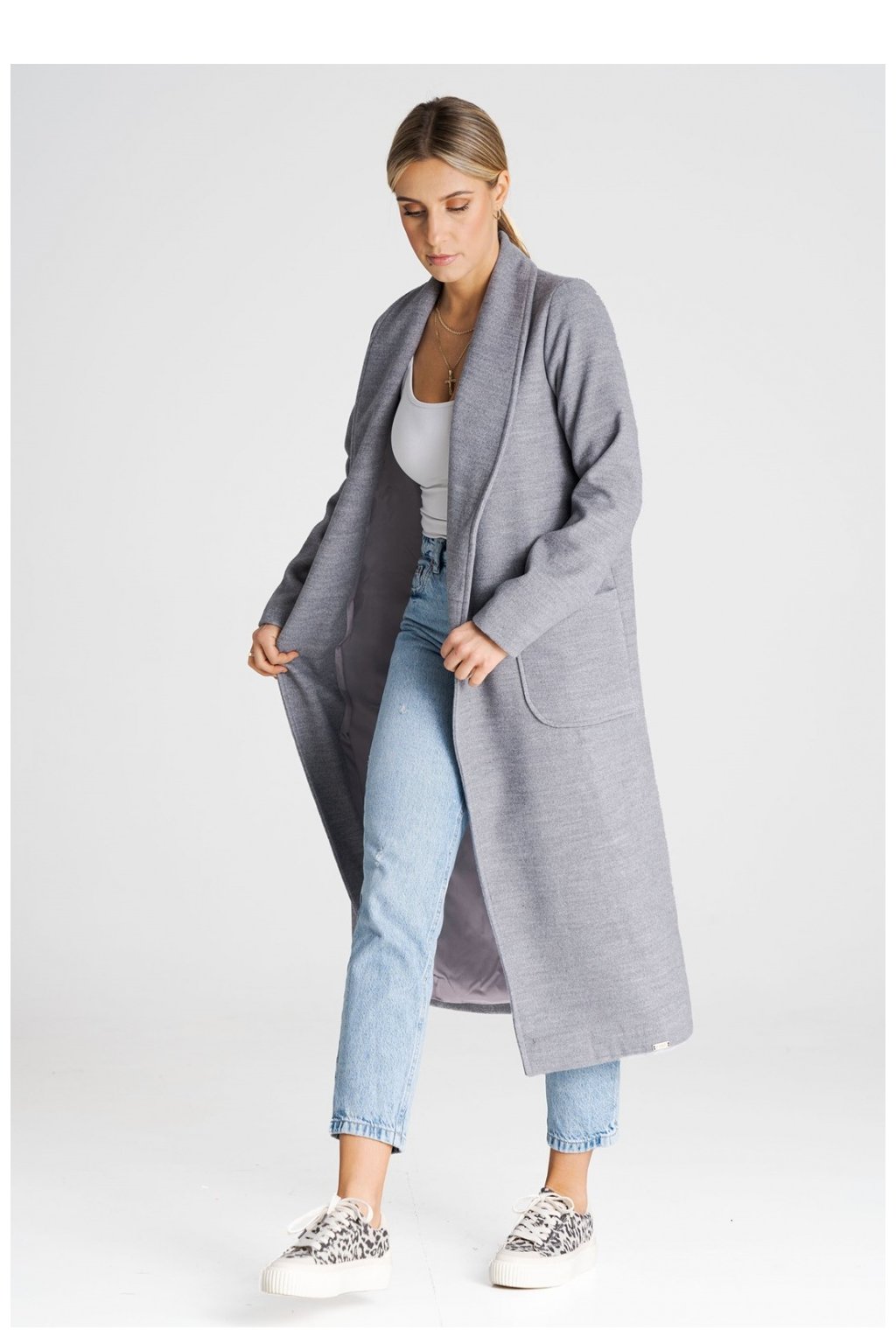 Dlouhý kabát s páskem na zavazování. Kabát s dlouhými rukávy bez zapínání. Kabát rovného střihu s velkými nakládanými kapsami.