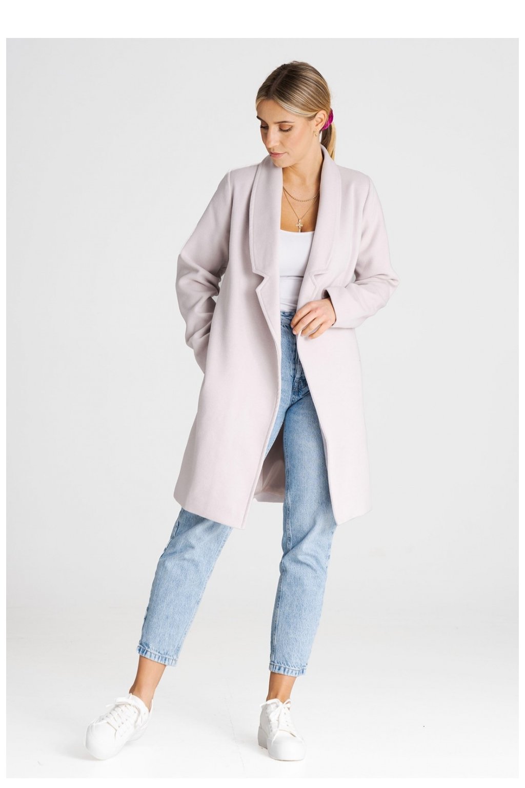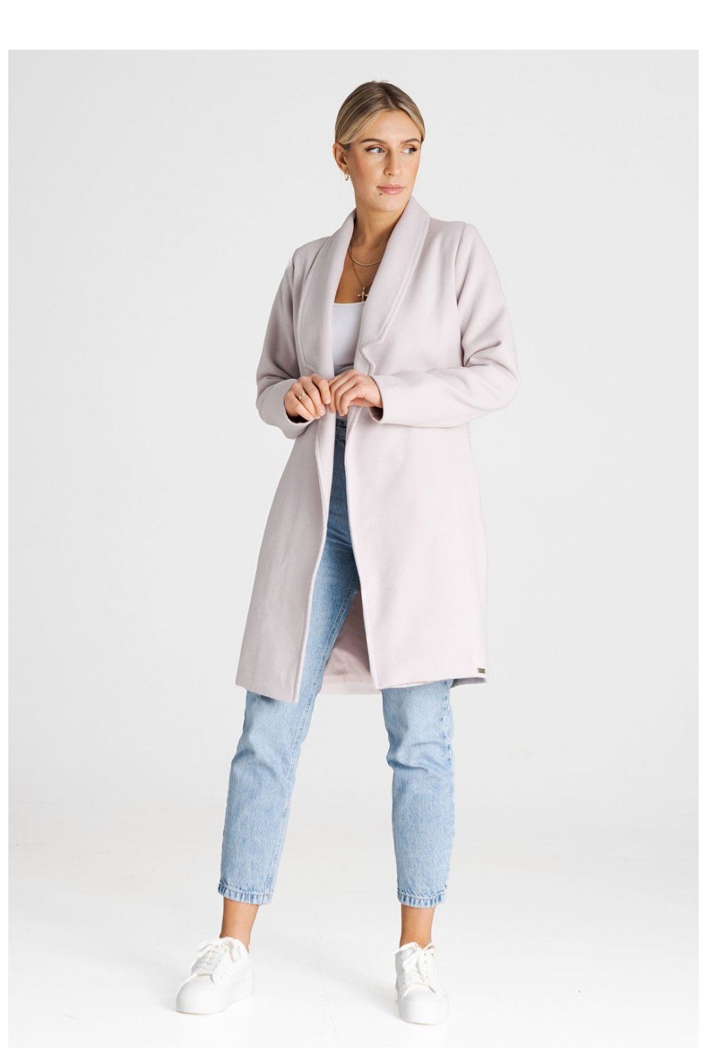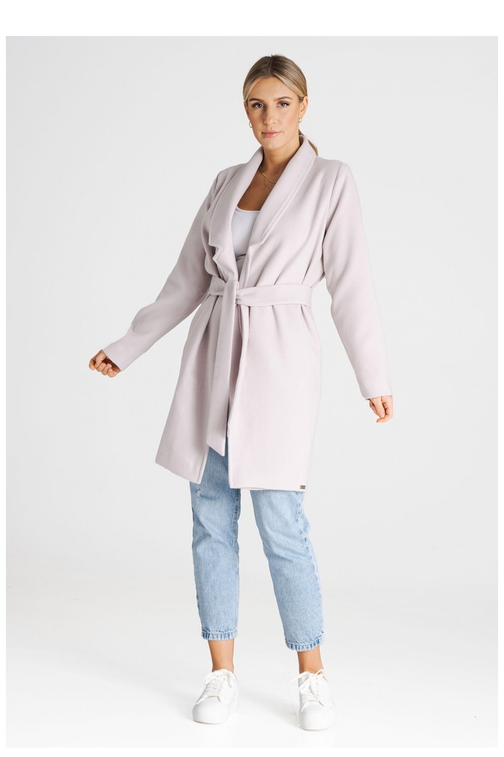 Rozepnutý kabát s velkým vycpaným límcem. Lze jej nosit dvěma způsoby, s připojeným páskem nebo bez něj. Vnitřní kapsy na bocích.