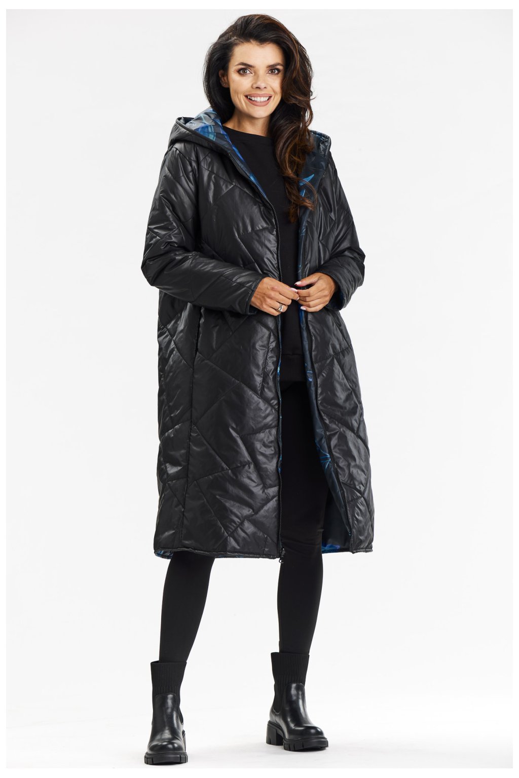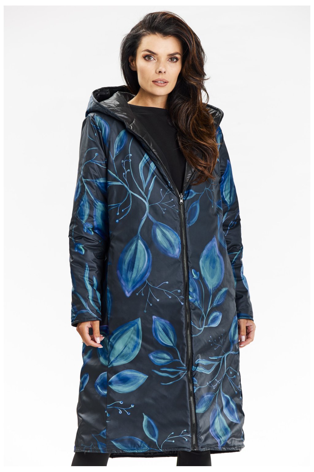 Oboustranný kabát s kapucí a zapínáním na zip. Oboustranný kabát s kapucí je dokonalou kombinací elegance a funkčnosti. Díky oboustrannému provedení jej můžete přizpůsobit své náladě, jedna strana je v klasickém, minimalistickém stylu, zatímco druhá je oživena listovým vzorem. Prošívaná tkanina poskytuje teplo a pohodlí, zatímco zip usnadňuje její používání a zasouvací kapsy pojmou potřebné drobnosti.