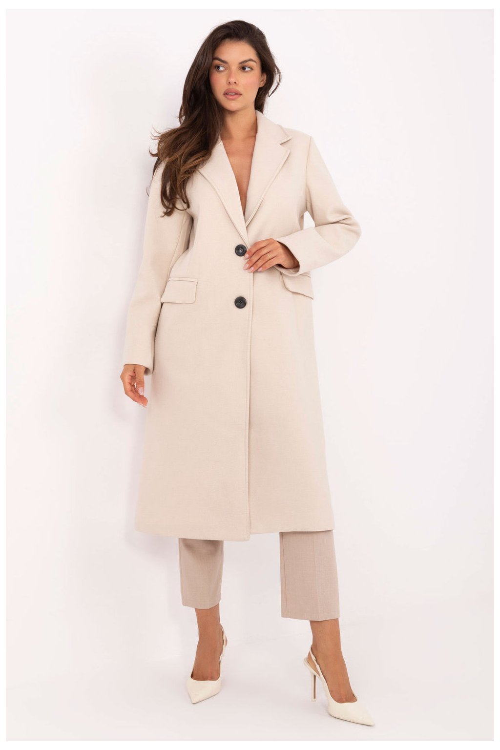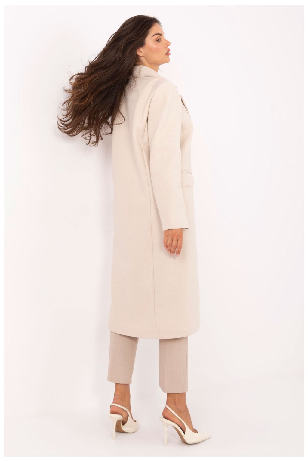 Elegantní dlouhý dámský kabát je nadčasovým modelem, který se skvěle hodí jak do každodenního života, tak i do pracovních stylizací nebo při slavnostních příležitostech. Vyrobený z polyesteru s hladkou strukturou materiálu vypadá minimalisticky a elegantně a zdůrazňuje klasický charakter. Kabát má vestavěné ramenní polštářky, které dávají siluetě jasně vyznačenou linii a elegantní střih. Otočené límce a jednoduché zapínání na knoflíky zdůrazňují jeho nadčasový střih. Model je vybaven podšívkou a praktickými kapsami skrytými pod překládkami, které dotvářejí celkový vzhled. Jedná se o lehký, přechodný kabát, skvělý na podzim, zimu a jaro, ideální volba pro ženy, které oceňují klasiku v moderním podání.