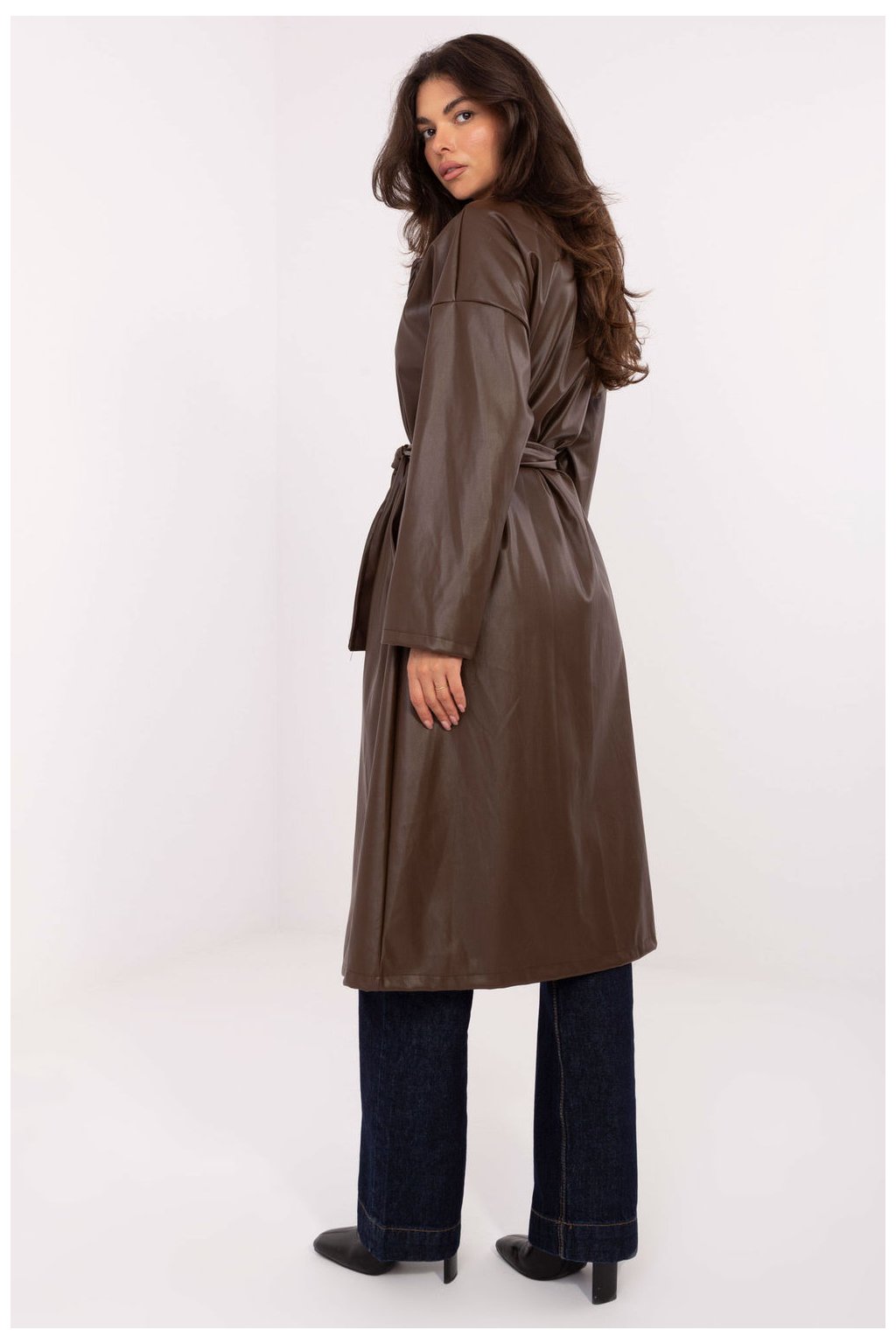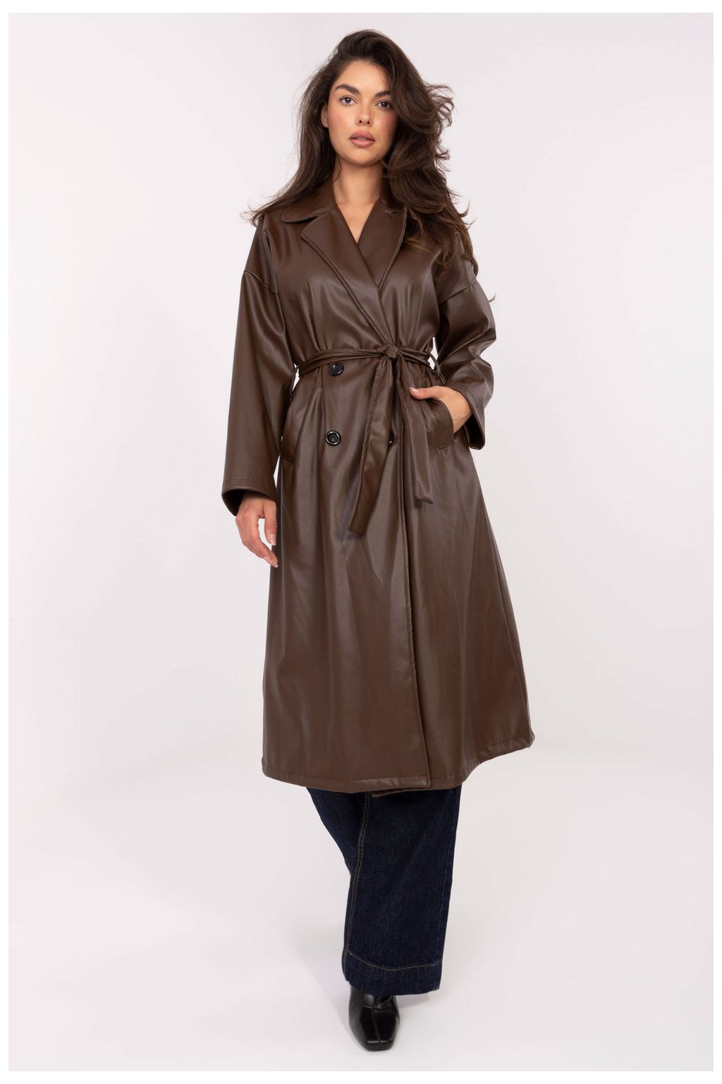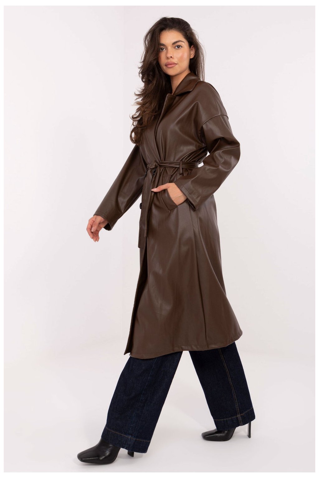 Dámský kožený kabát s nadčasovým, casual charakterem, ideální jako přechodný vrchní oděv na podzim, zimu a jaro. Vyrobený z vysoce kvalitní směsi polyesteru a polyuretanu, vyniká hladkou fakturou a elegantním vzhledem. Model po kolena byl navržen s důrazem na detaily: má klasické skládané límce, vsunuté kapsy a dlouhý rukáv. Dvojitý řadový uzávěr na knoflíky mu dodává eleganci a pásek na vázání v pasu umožňuje zdůraznit postavu a přizpůsobit střih svým preferencím. Lehký, nezateplený, skvěle se hodí do každodenních stylizací, spojujíc pohodlí s moderním, nadčasovým designem. Jedná se o univerzální kabát, který přidá šarm každému outfitu.