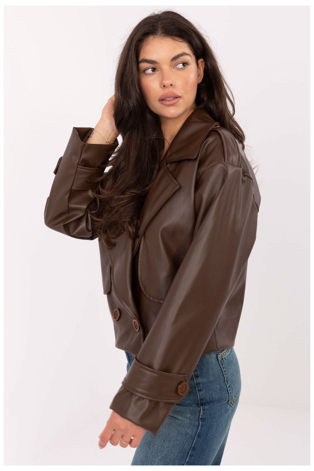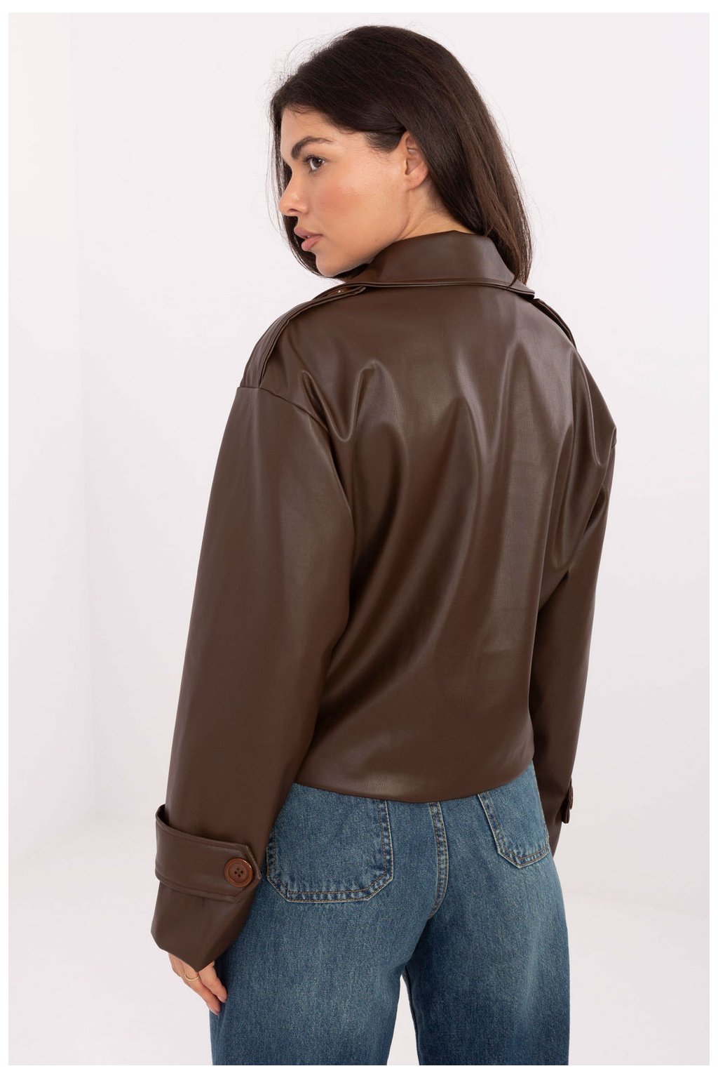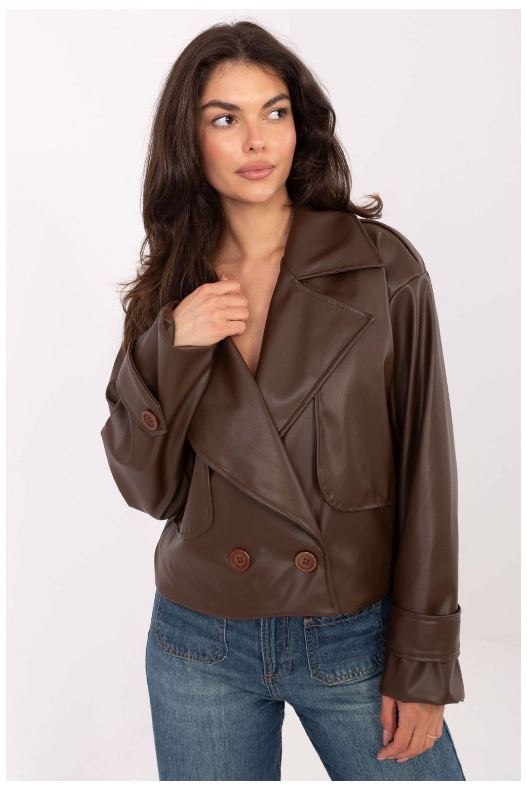 Krátký dámský trenčkot z ekokůže je moderní interpretací klasiky, ideální jako přechodný kabát na podzim, zimu, jaro. Vyrobený z vysoce kvalitní směsi polyesteru a polyuretanu, vyniká hladkou fakturou a elegantním, zároveň ležérním stylem, skvěle se hodícím do každodenních stylizací. Model byl navržen s velkým límcem a širokými límci, které mu dodávají charakter. Dvojřadé zapínání na knoflíky zdůrazňuje klasický střih, a náramky na ramenech vnášejí vojenskou notu typickou pro trenčkot. Kabát má také podšívku, co zvyšuje pohodlí nošení a dělá celkový vzhled mimořádně pečlivým. Krátká délka a jednoduchý střih dělají z tohoto modelu univerzální kousek šatníku, ideální pro každodenní, městské stylizace s nádechem elegance.