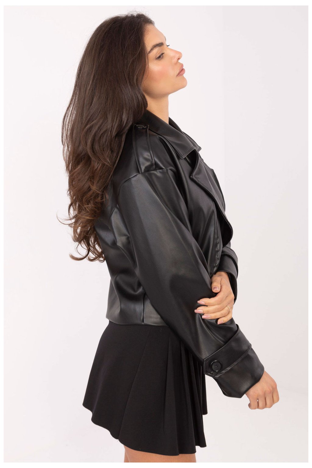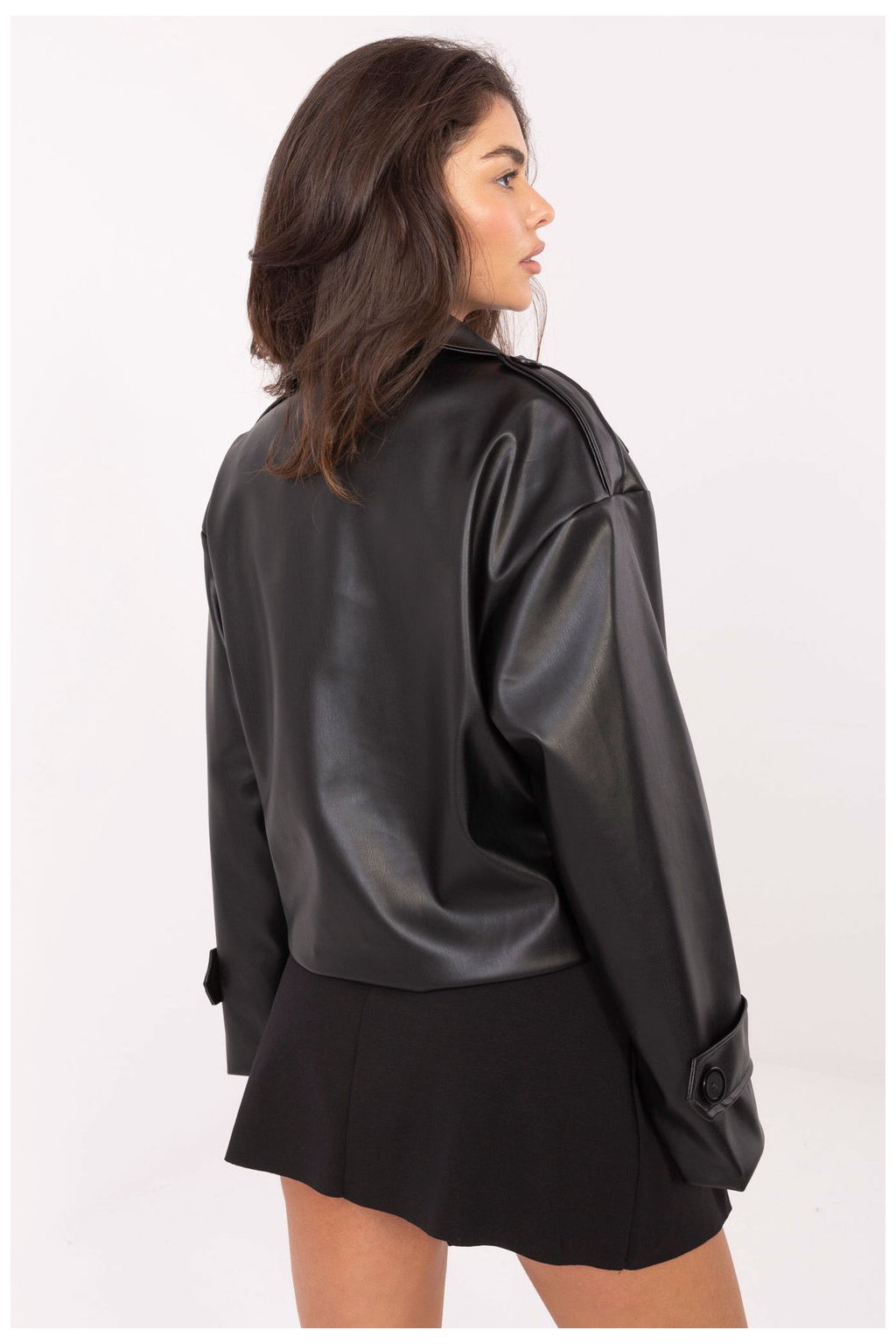 Krátký dámský trenčkot z ekokože je moderní verze klasiky, ideální jako přechodný kabát na podzim, zimu a jaro. Vyrobený z vysoce kvalitní směsi polyesteru a polyuretanu, vyniká hladkou fakturou a elegantním, ale zároveň casual stylem, skvělým pro každodenní stylizace. Model byl navržen s velkým límcem a širokými límci, které mu dodávají charakter. Dvojřadé zapínání na knoflíky zdůrazňuje klasický střih, a náramky na ramenou přidávají vojenský nádech typický pro trenčkot. Kabát má také podšívku, co zvyšuje pohodlí nošení a dělá celkový vzhled mimořádně pečlivým. Krátká délka a jednoduchý střih dělají z tohoto modelu univerzální kousek šatníku, ideální pro každodenní, městské stylizace s nádechem elegance.