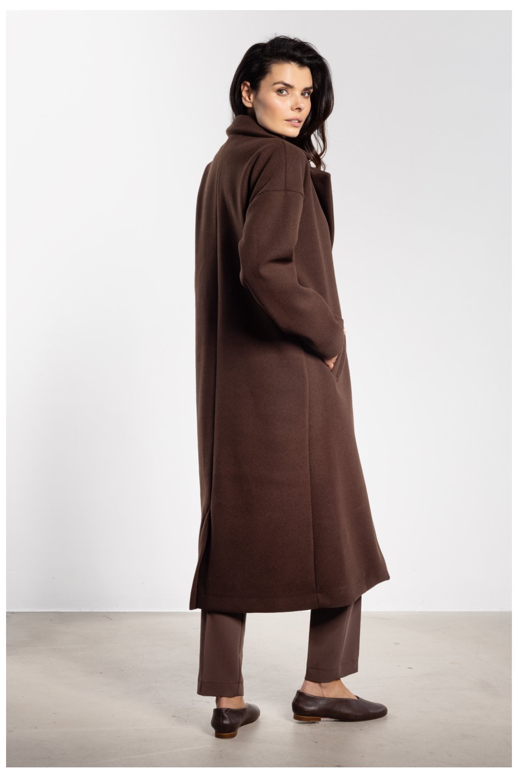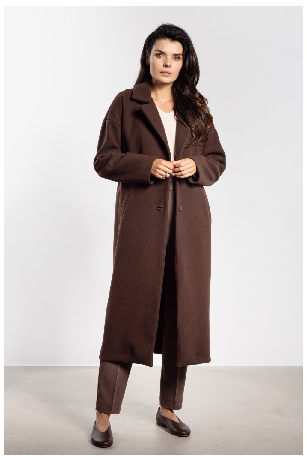 Elegantní dámský kabát s jednoduchým a minimalistickým střihem je must-have v podzimně-zimní garderobě. Midi délka a klasické klopy dodávají modelu nadčasový charakter, a přiložený pásek umožňuje zdůraznit pas nebo nosit kabát ve volnějším provedení pro více casual efekt. Jednoduchý střih zajišťuje pohodlí a volnost pohybu, a praktické boční kapsy přidávají funkčnost. Model se hodí jak do pracovních stylizací, tak na speciální příležitosti, kombinujíc eleganci s univerzálností.