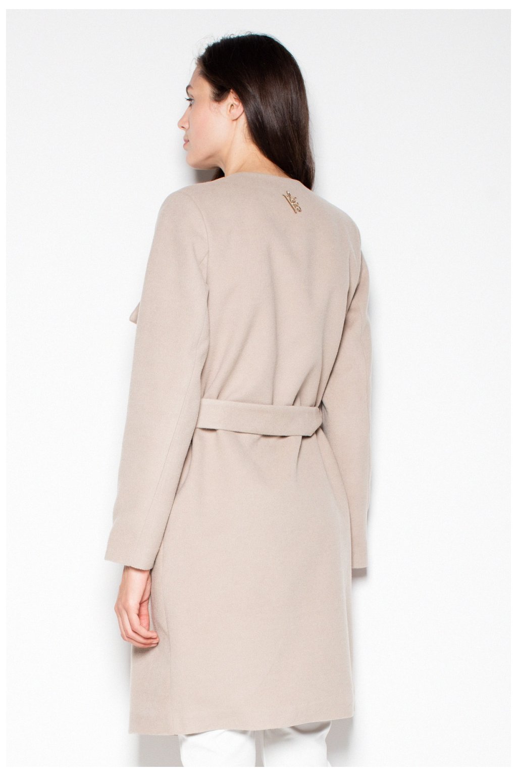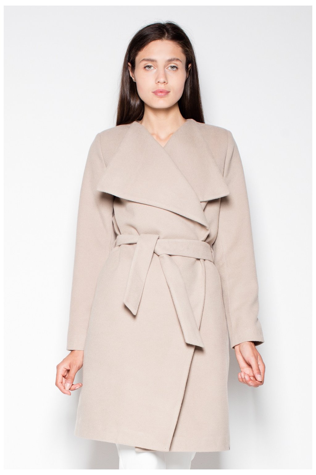 Elegantní kabát, zavazovaný v pase s působivým rozšířeným límcem. Model klasického střihu.
