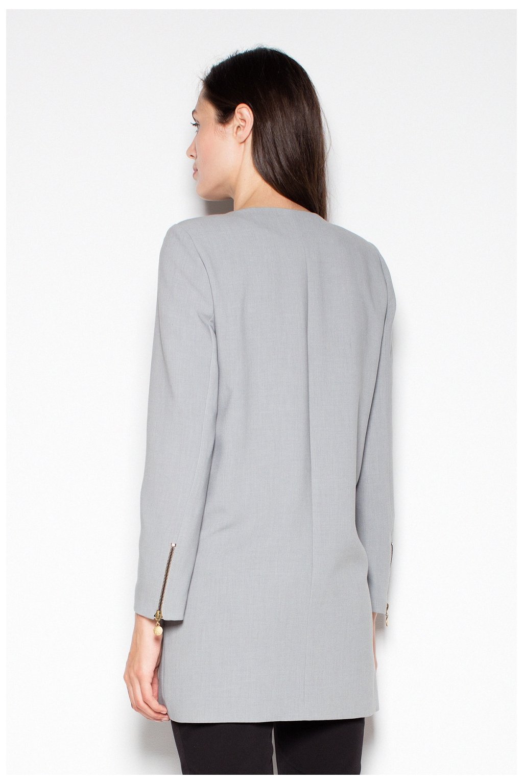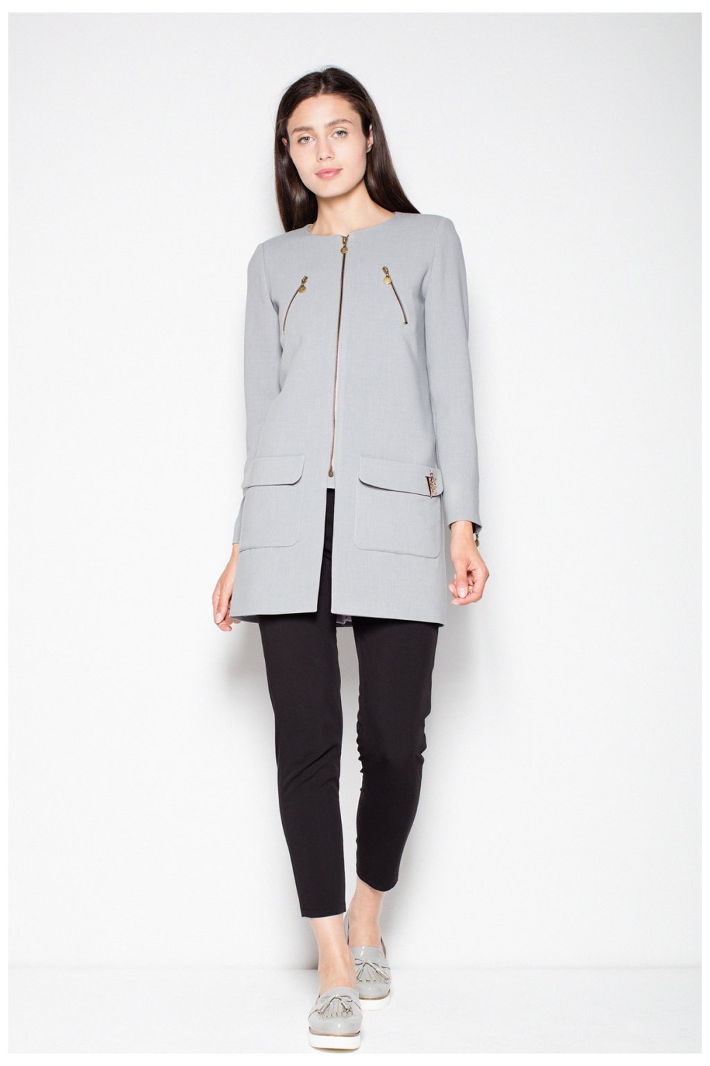 Rovně střižený kabát na zip s ozdobnými kapsami a nápadným rozparkem na zipu. Ozdobné zipy na manžetách a límci. Skvěle se hodí pro každodenní styling.