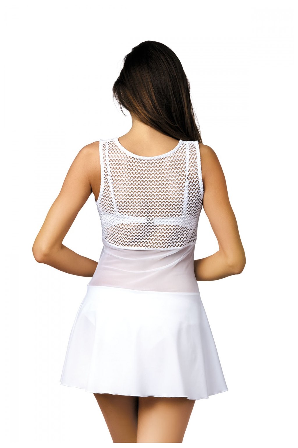 Novinka! Pohodlná tunika inspirovaná nejnovějšími módními trendy. Ažurový síťovaný horní díl lehce chrání tělo před sluncem, zatímco hladký, vzdušný spodní díl jemně zakrývá boky. Střed je pro změnu z poloprůhledného tylu. Střih bez ramínek připomíná pohodlné letní šaty. Italská tkanina nejvyšší kvality.Dámská tunika na ramínka.
