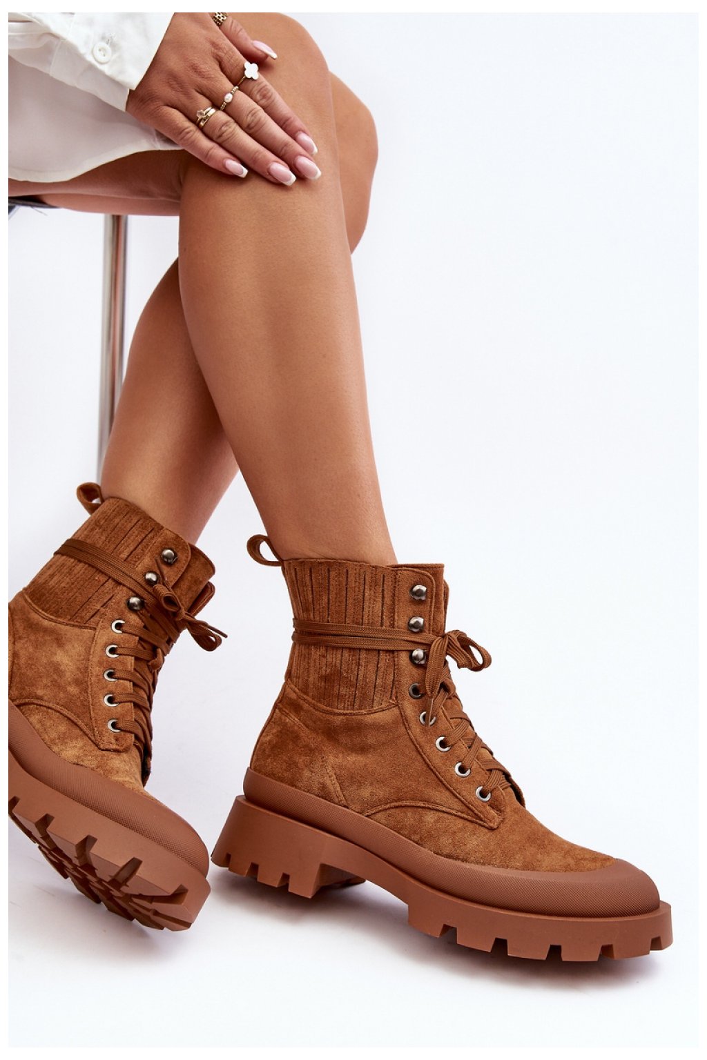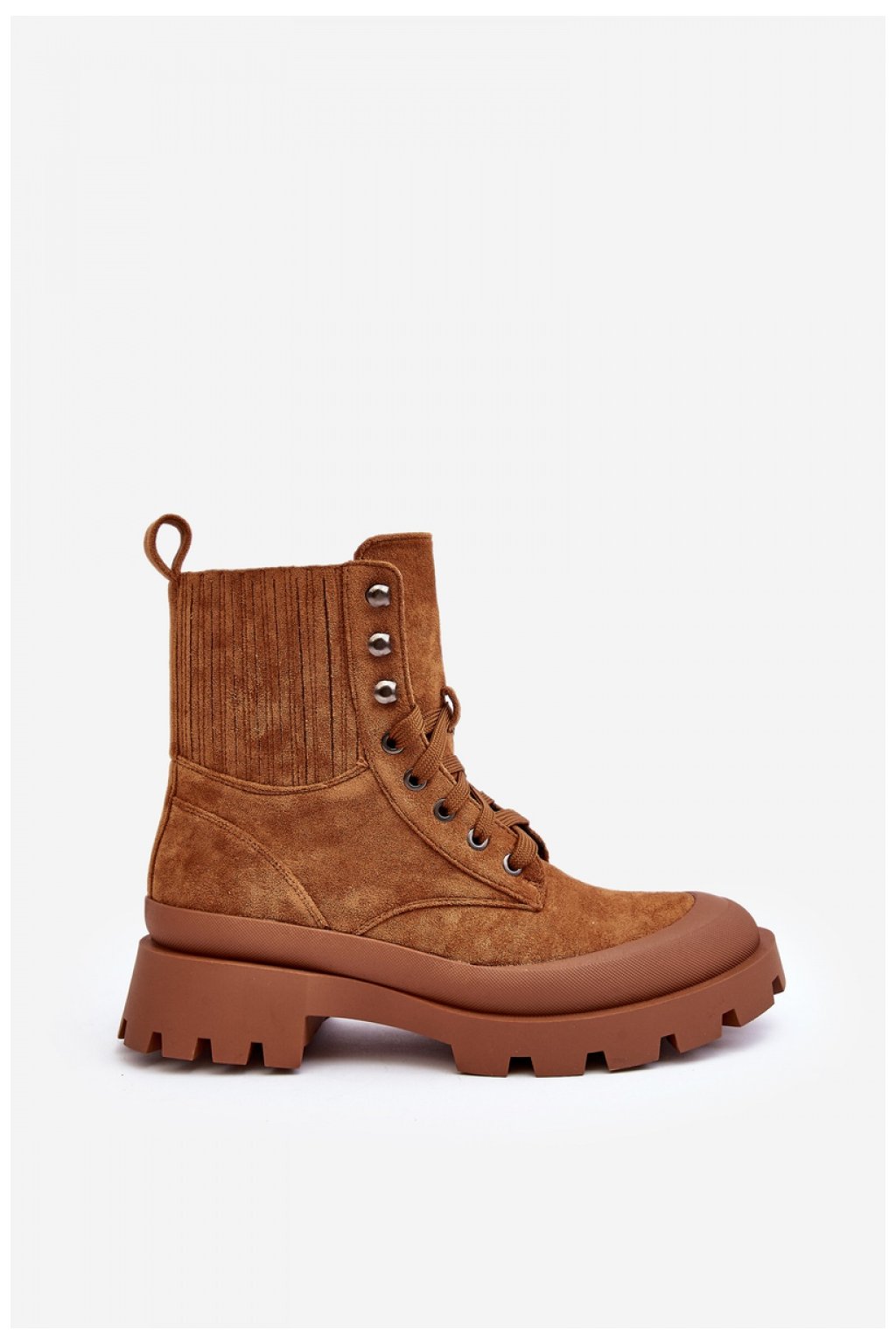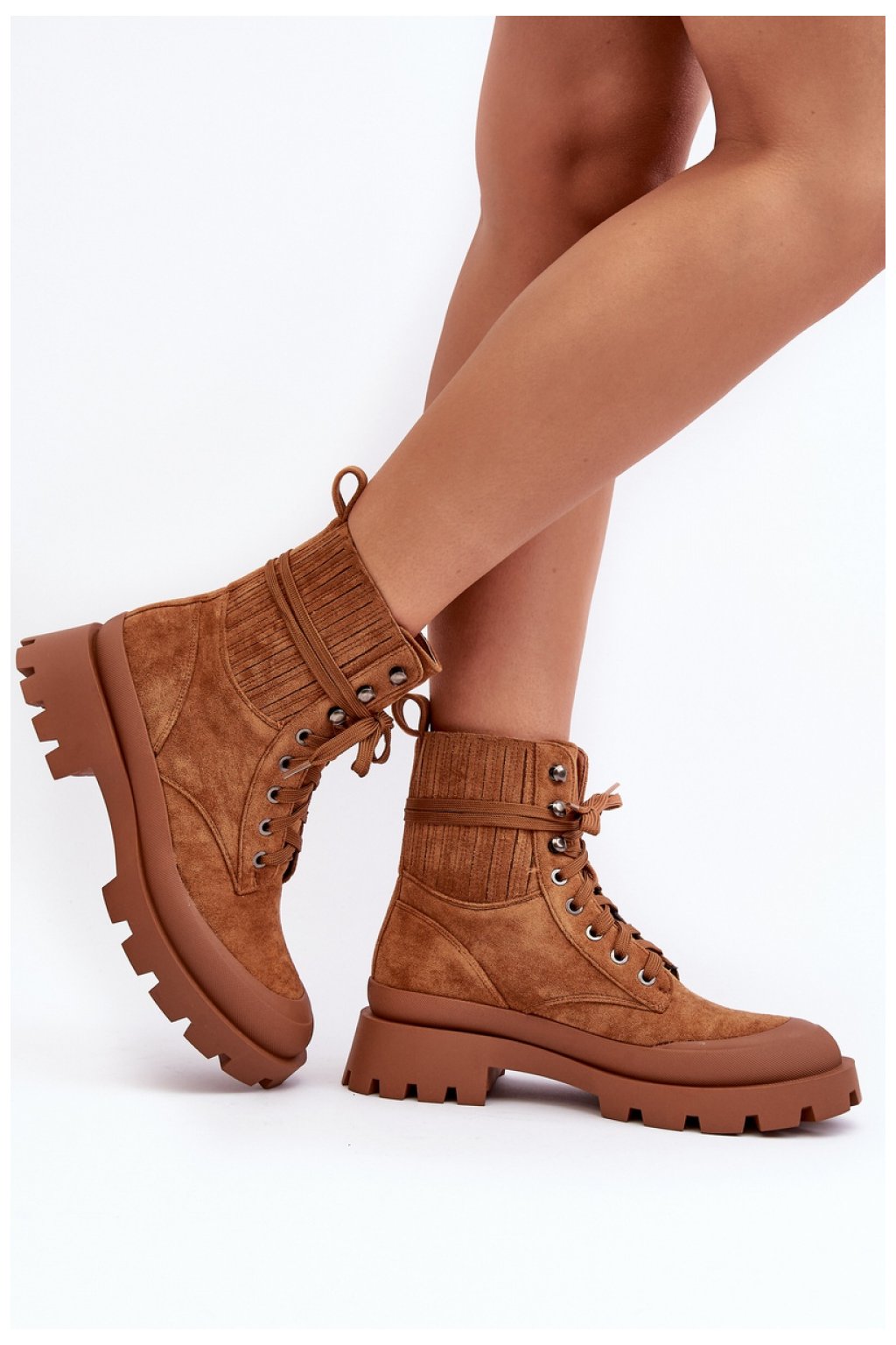Dámské trapery z ekologického semiše. Šněrovací model. Osazené na silné podrážce a plochém podpatku. Zaoblená špička. Svršek v délce ke kotníkům. Střed podšitý přikrývkou na boty. Vyztužená patní část. Využijte tento klasický model k mnoha podzimně-zimním outfitům!