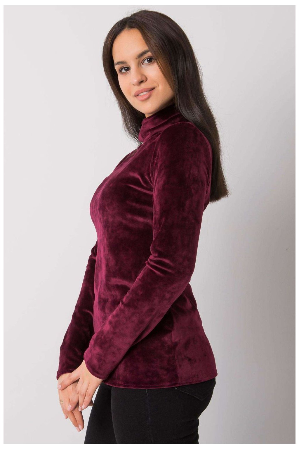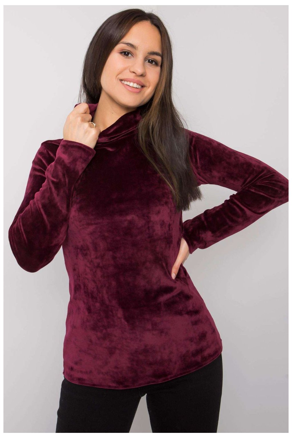 Velurový rolák ve vínové barvě, rovný střih s dlouhými rukávy. Skvěle se hodí pro mnoho příležitostí.