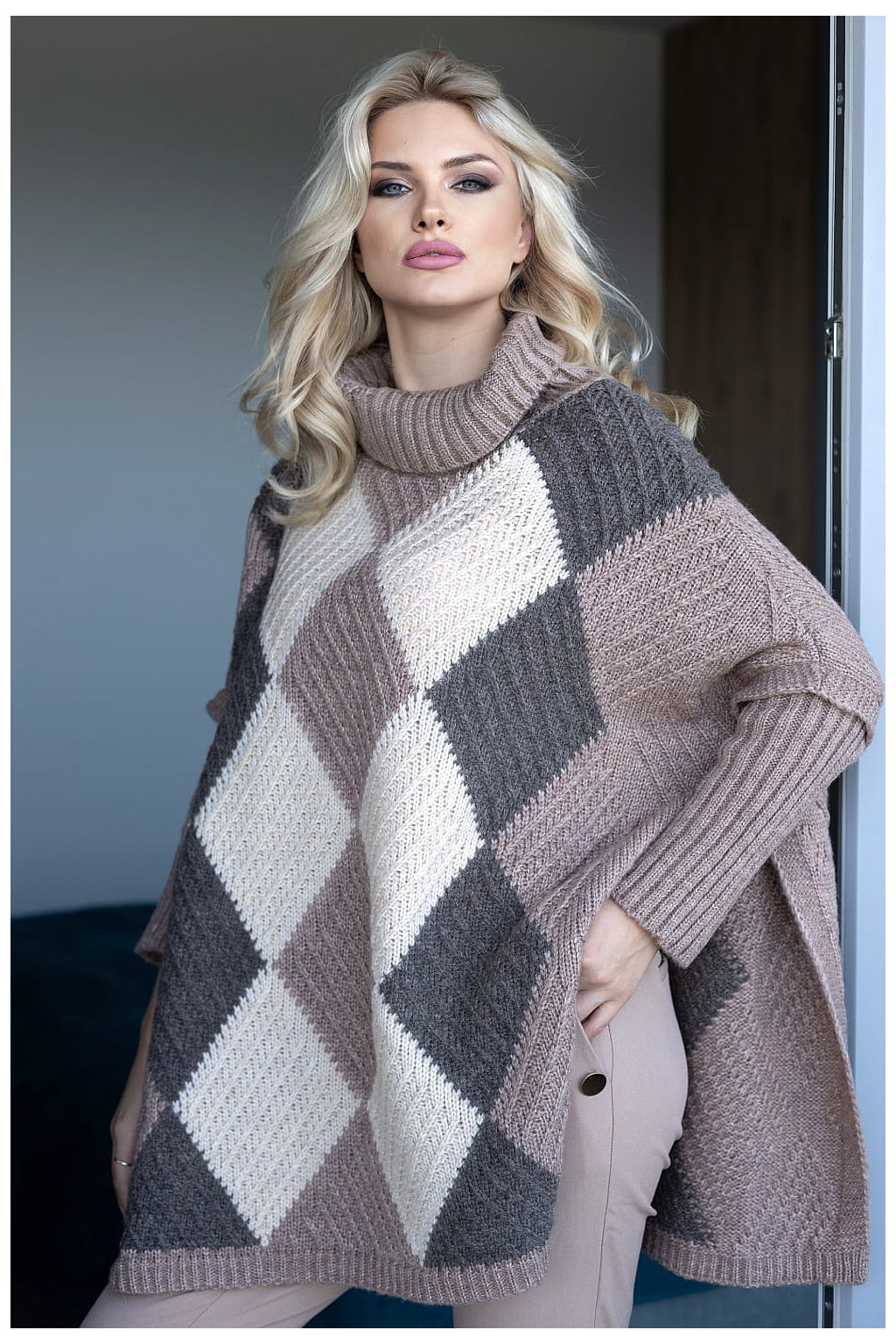 Dámský svetr pončo střihu s dlouhými rukávy a rolákem. Svetr je měkký a nadýchaný na dotek.