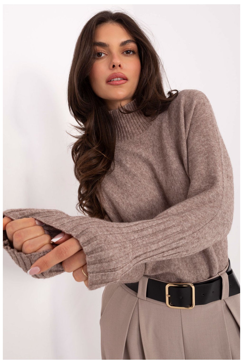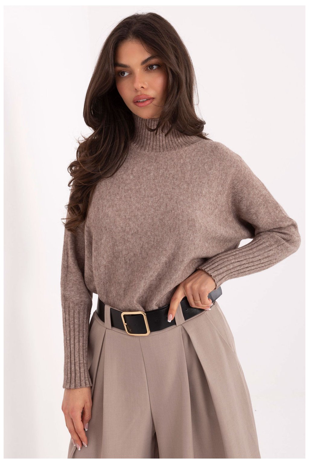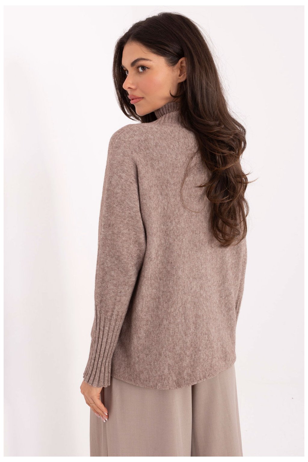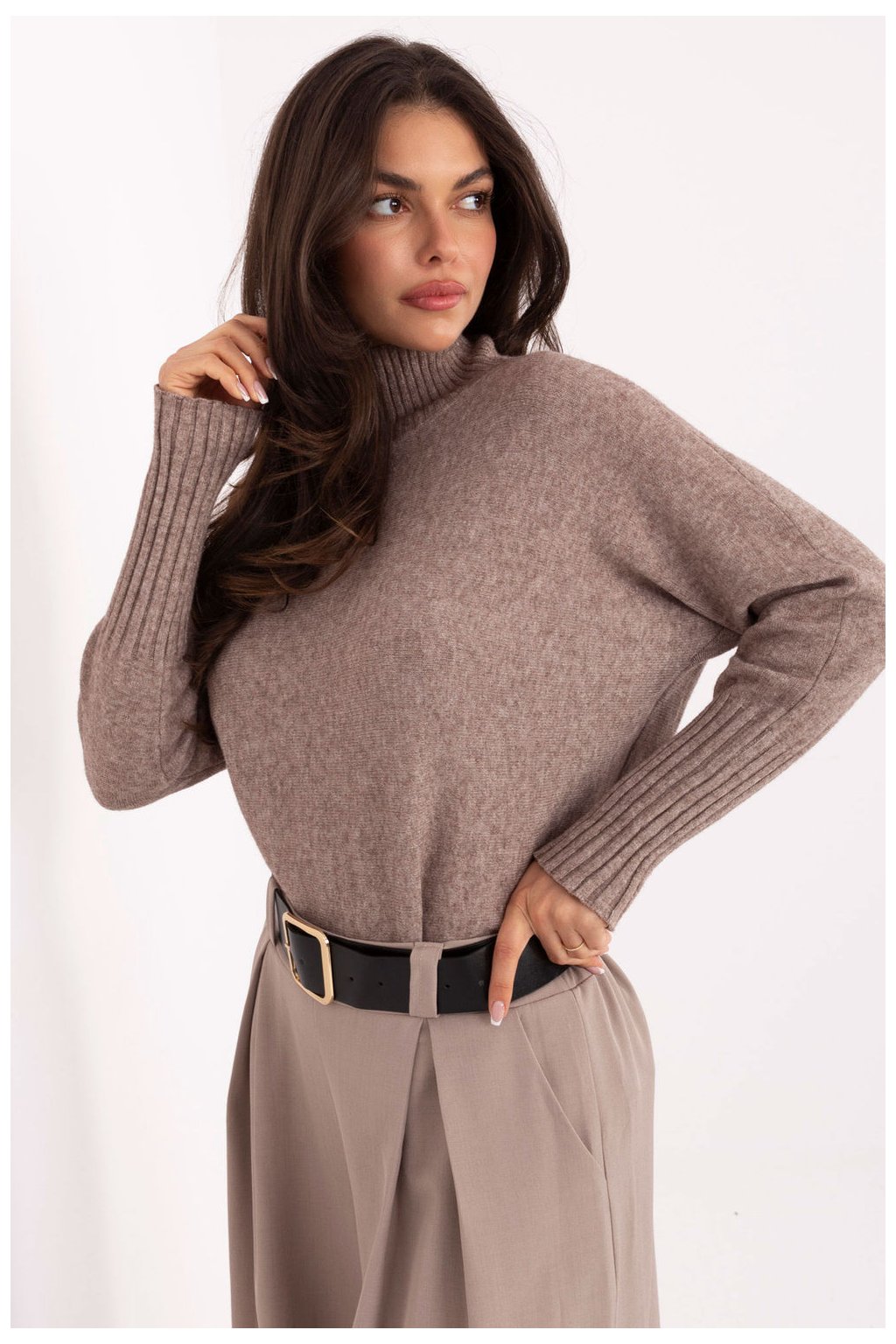 Klasický dámský svetr s golfovým límcem, držený v casual stylu, je must-have v každé garderobě. Vyrobený z vysoce kvalitní směsi viskózy, polyamidu a polyesteru, je měkký, příjemný na dotek a pohodlný na nošení po celý den. Model má standardní délku a dlouhé rukávy zakončené žebrovanými lemy, co mu dodává estetický vzhled a zajistí dobré padnutí. Hladký vzor dělá svetr univerzálním a snadno se kombinuje. Ideální na každý den a do práce, skvěle se hodí jak k kalhotám, tak k sukni, vytvářejíc elegantní, ale volný look.