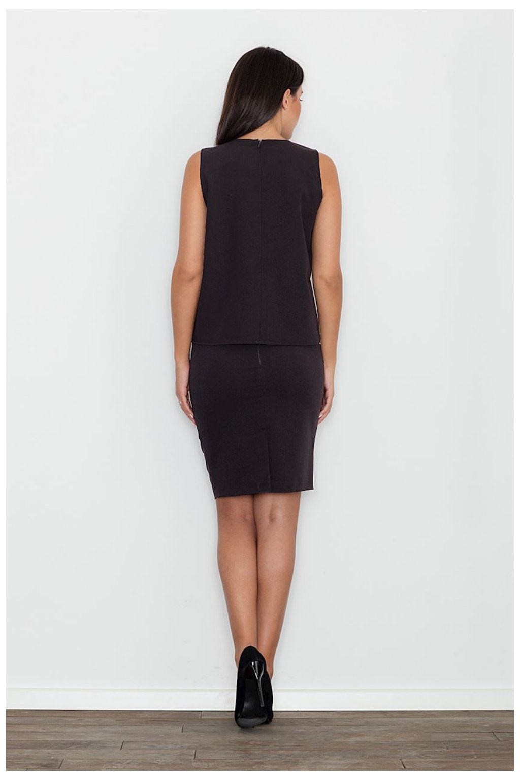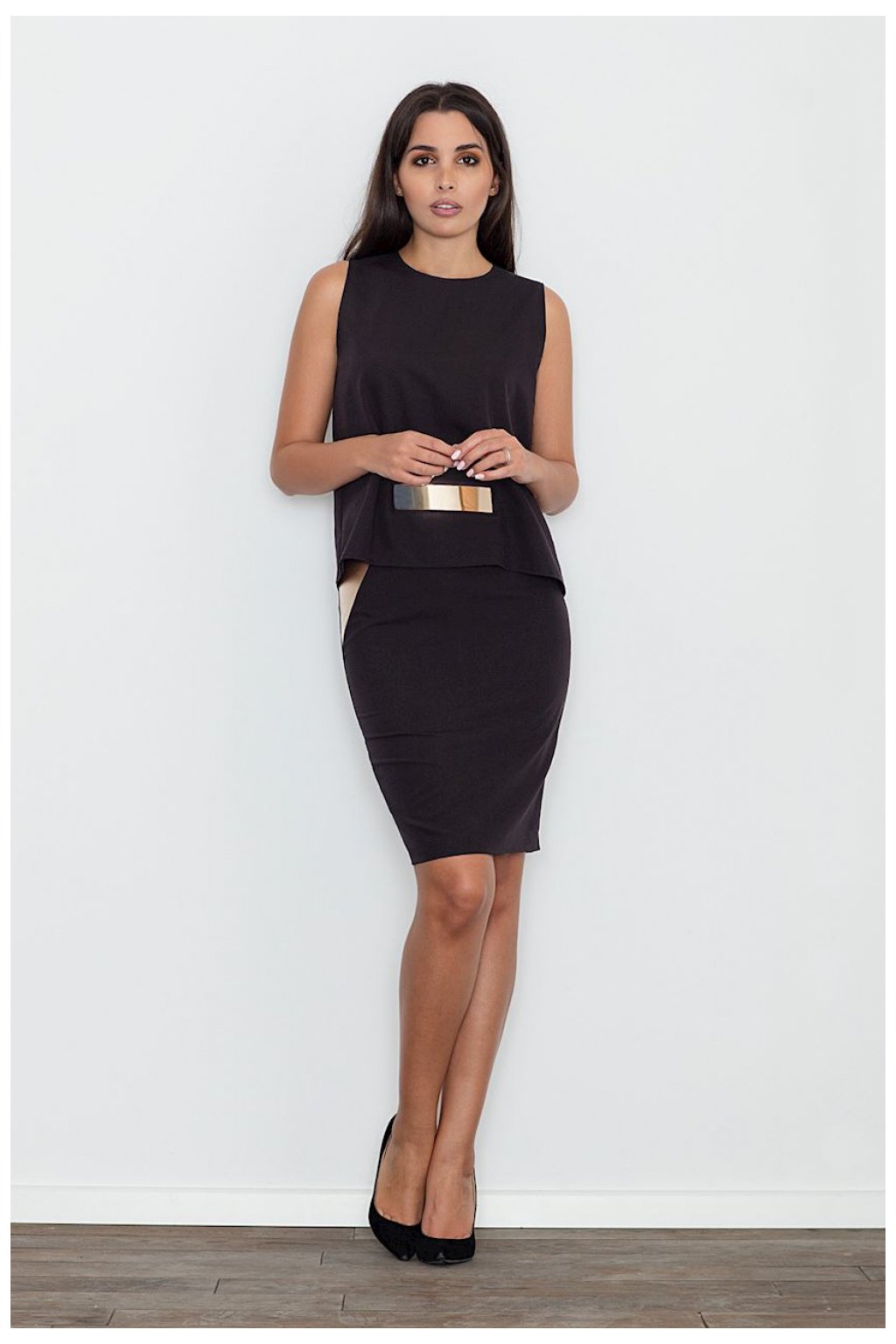 Elegantní sada v jednoduchém provedení. Halenka s ozdobným zlatým akcentem dodává eleganci a modernost. Přiléhavá sukně před kolena s vložkami z ekokůže, krytý zip. Sada je ideální pro mnoho denních i večerních příležitostí.