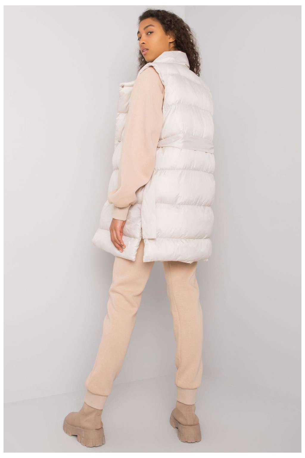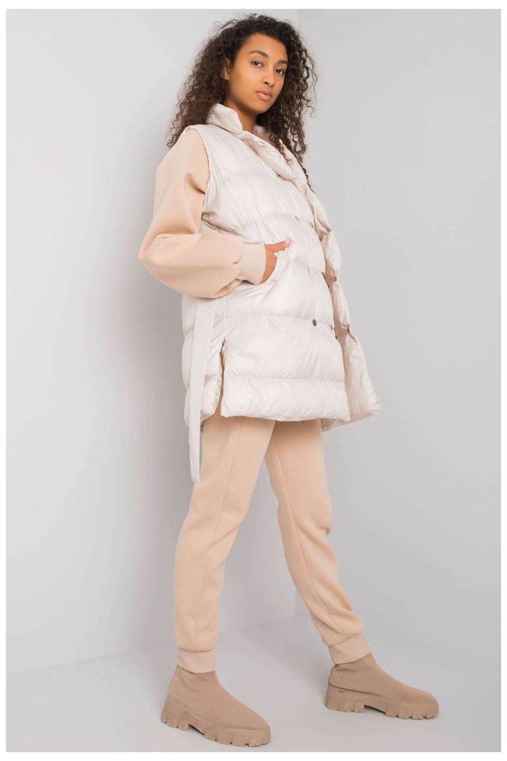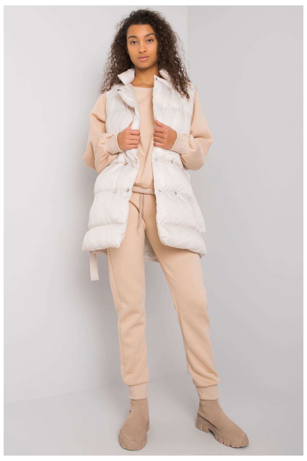 Zajímavá souprava sestávající z péřové vesty, mikiny a tepláků. Vesta se zapíná na patentky a na bocích jsou kapsy. Mikina rovného střihu s dlouhými rukávy. Tepláky se zavazováním v pase a nakládanými kapsami.Polyester 30 %