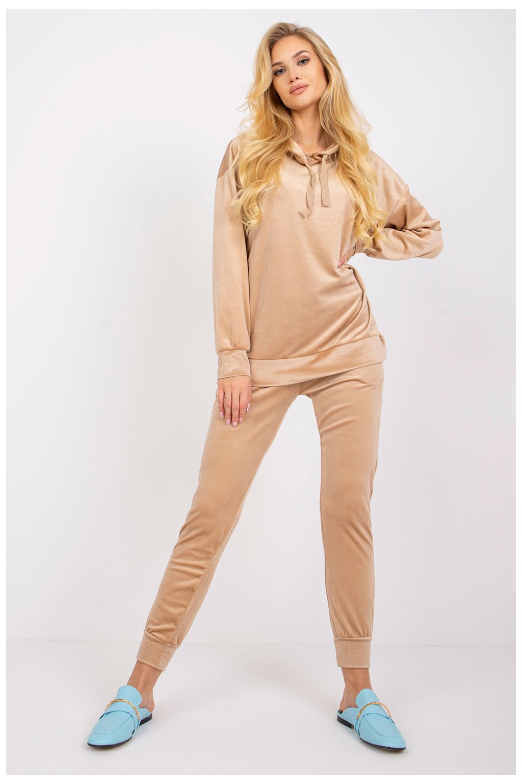 Velurová mikinová souprava sestávající z mikiny a kalhot. Mikina s dlouhými rukávy a kapucí, kalhoty s kapsami a zavazováním v pase.