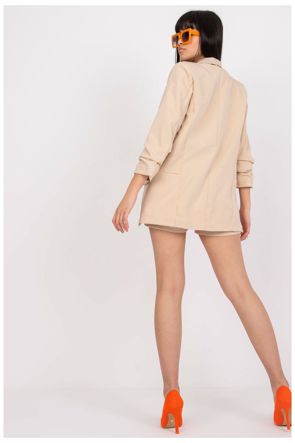 Elegantní souprava sestávající ze saka a šortek. Bunda s podšívkou, ramenními vycpávkami a záhyby. Sako s 3/4 rukávy, bez knoflíku. Šortky s elastickým pasem, vysokým sedem a kapsami na bocích. Šortky mají navíc ozdobný pásek. Sada ideální pro mnoho příležitostí. Obvod pasu v tabulce se vztahuje na šortky.